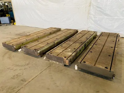 PLATE WIDTH....................: 31" PLATE LENGTH...................: 130" PLATE THICKNESS................: 8" # OF T SLOTS PER PLATE.........: 2 T SLOT SPACING.................: 24" & 5-1/2" # OF LEVELING HOLES............: 12 PER PLATE, 48 TOTAL T SLOT DIMENSIONS: WIDTH OF AT TOP................: 7/8" WIDTH AT BOTTOM................: 1/1/2" DEPTH..........................: 1-3/8" PLATES CAN BE SOLD ALL TOGETHER OR SOLD INDIVIDUALLY |