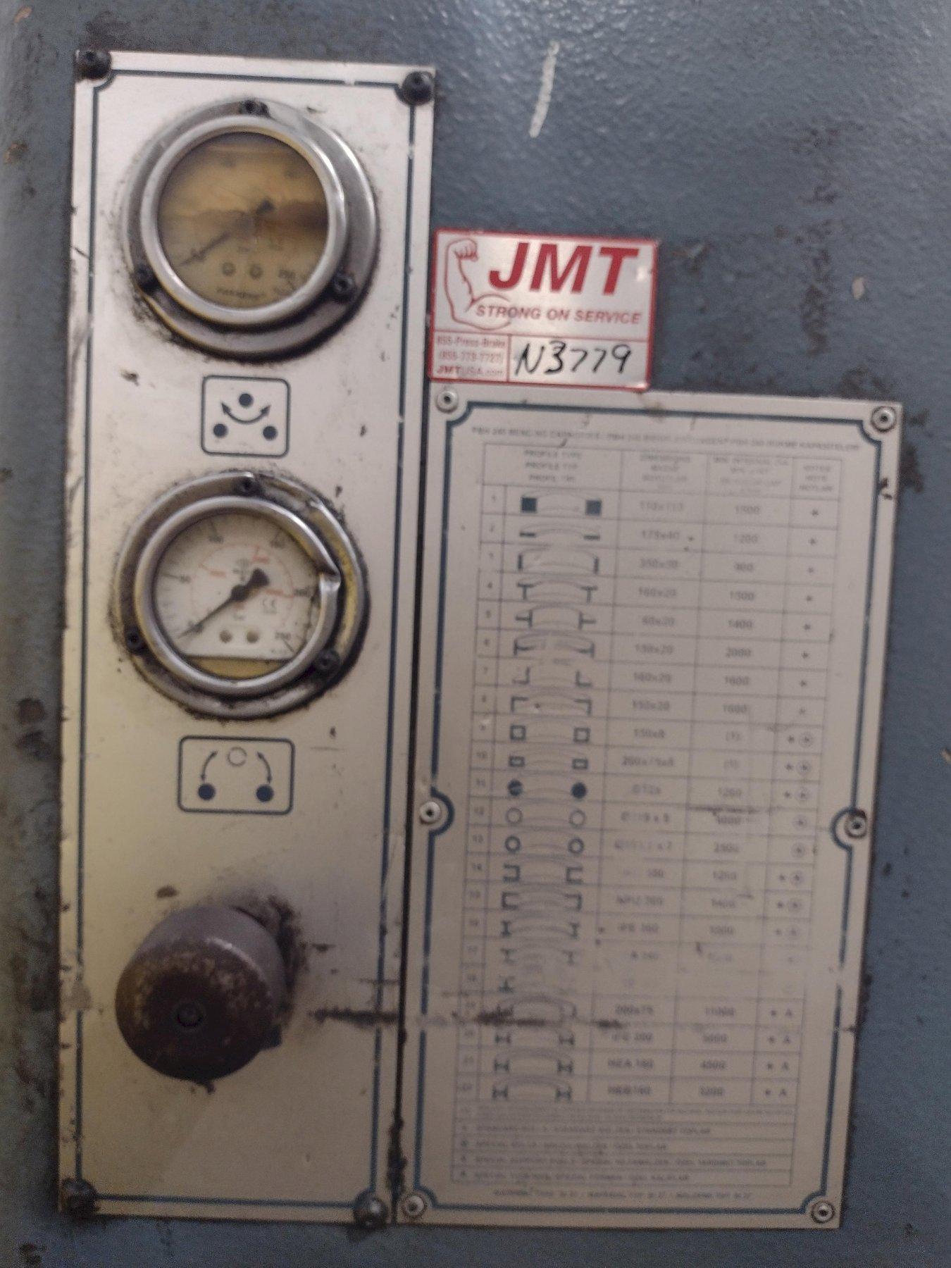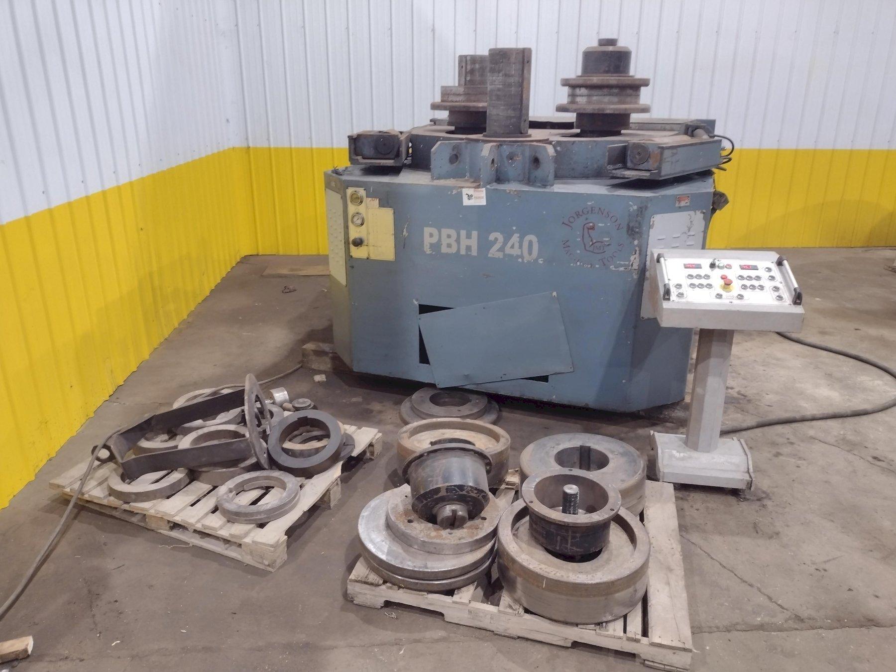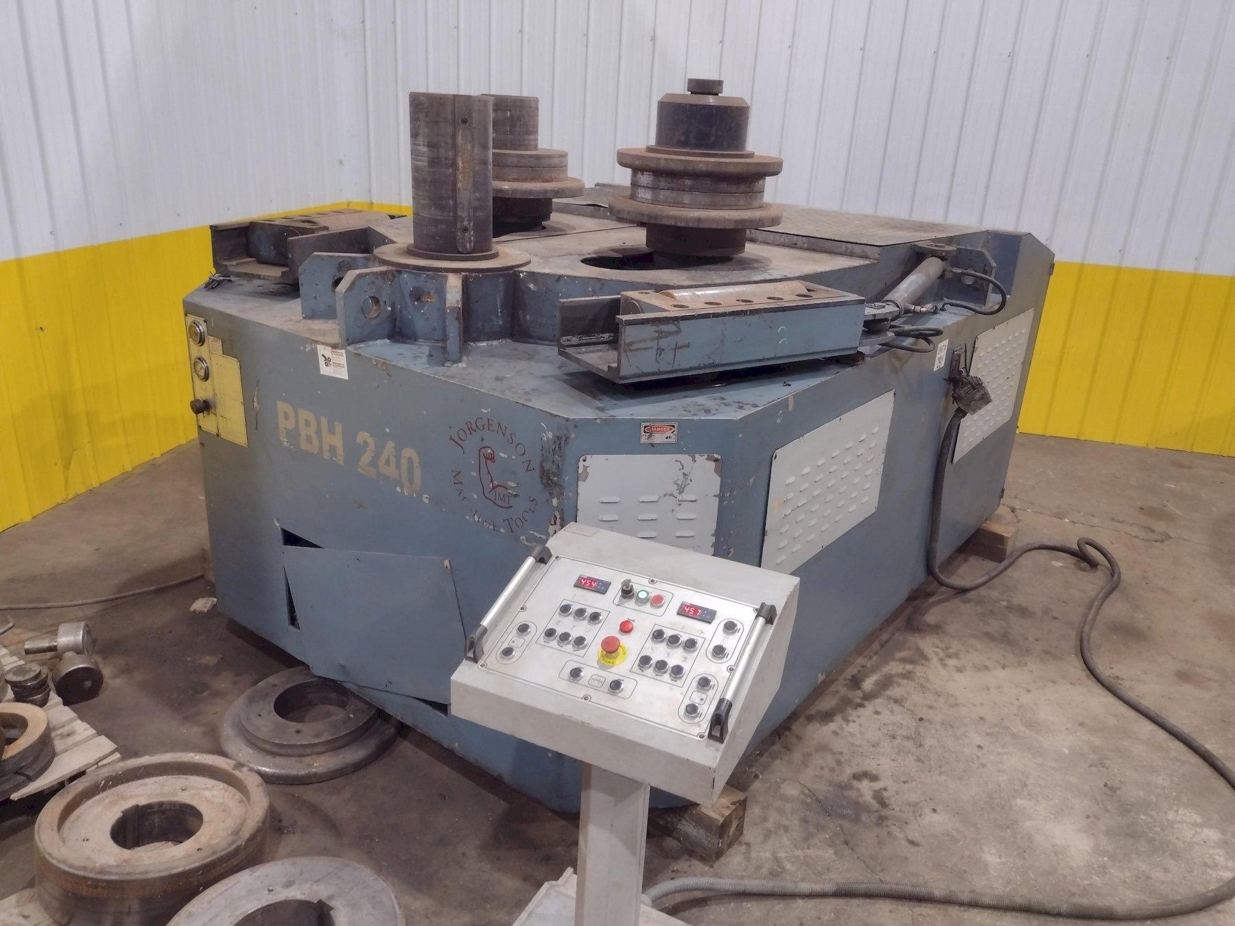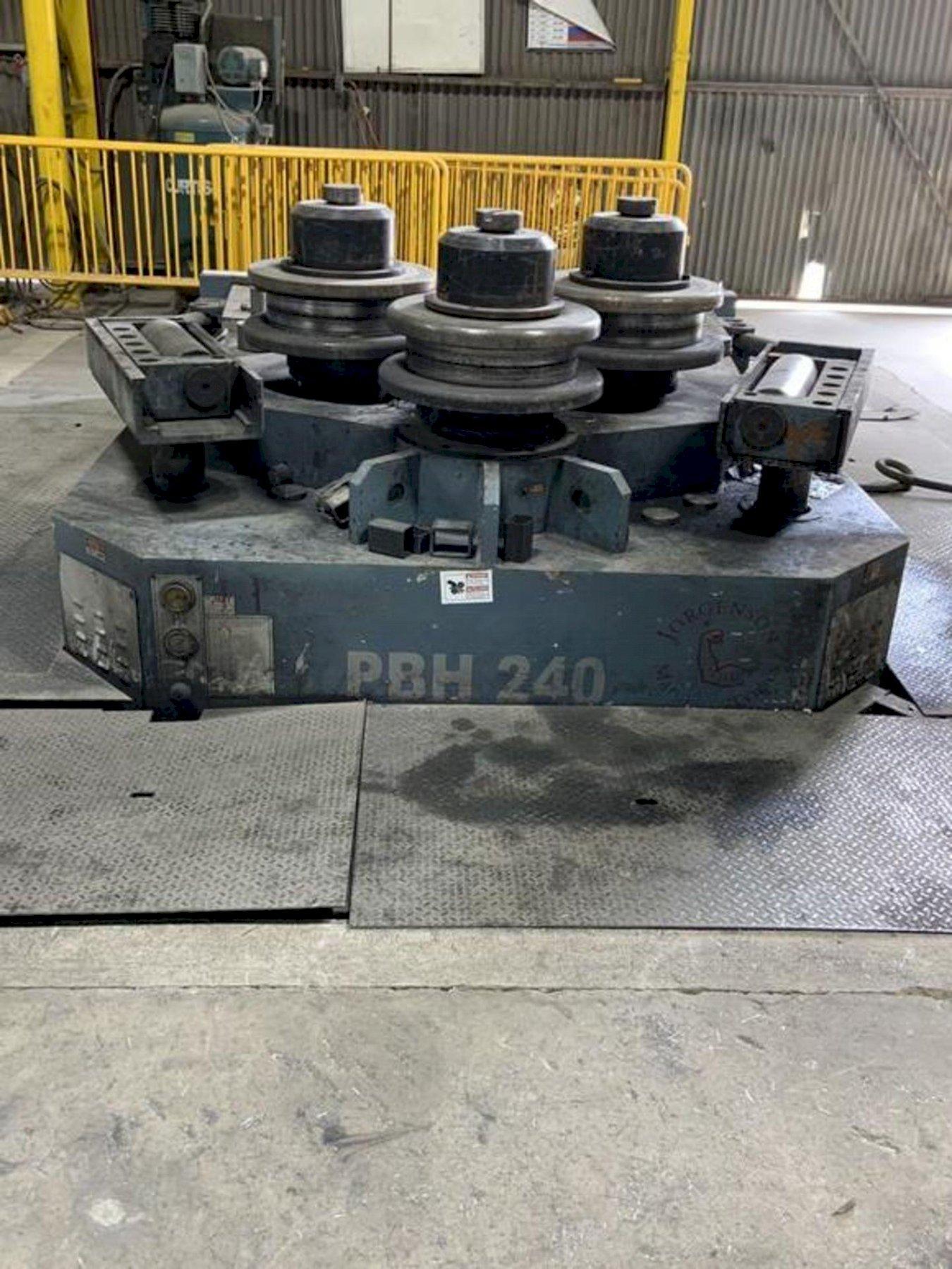 MODEL ............................ PBH240 YEAR NEW ......................... 2009 ROLLING CAPACITIES: ANGLE ............................ 6" X 6" X 3/4" SQUARE SOLID ..................... 4-3/8" X 4-3/8" X 52" ID ROLL DIAMETER .................... 22" SHAFT DIAMETER ................... 8.7" VARIABLE SPEED ................... 0 TO 23 FPM FORWARD & REVERSE ................ YES ROLL ADJUSTEMENT ................. HYDRAULIC SIDE ROLLS DIGITAL READ OUT ...... YES POWERED GUIDE ROLLERS ............ YES GUIDE ROLLS VERTICAL ADJUSTMENT .. YES OPERATOR CONTROL STATION ......... YES E-STOP BUTTON .................... YES MOTOR ............................ 40 HP |