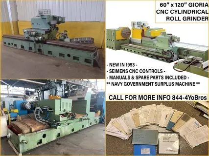 PLEASE CALL FOR MORE INFO @ 419-269-2000 SERIAL ................... 93523 YEAR NEW ................. 1993 MODEL .................... R/150-3000-CNC CONTROLS & ELECTRICS ..... SEIMENS CONTROL STATION .......... SIEMENS SINUMERIK SWING CAPACITY ........... 60" LENGTH CAPACITY .......... 118" SPEED READOUTS ........... DIGITAL TIP ROTATION ............. CLOCKWISE & ANTI-CLOCKWISE X AXIS RAPID TRAVERSE .... YES POWERED TAILSTOCK ........ YES LUBRICATION SYSTEM ....... YES COOLANT SYSTEM ........... YES (1)GRINDING WHEEL SIZE ... 40" DIAMETER x 4" THICK x 12" ID (2)GRINDING WHEEL SIZE ... 34-5/8" DIAMETER x 3-3/4" THICK x 12" ID (3)GRINDING WHEEL SIZE ... 40" DIAMETER x 2-1/2" THICK x 12" ID (4)GRINDING WHEEL SIZE ... 40" DIAMETER x 3" THICK x 12" ID |