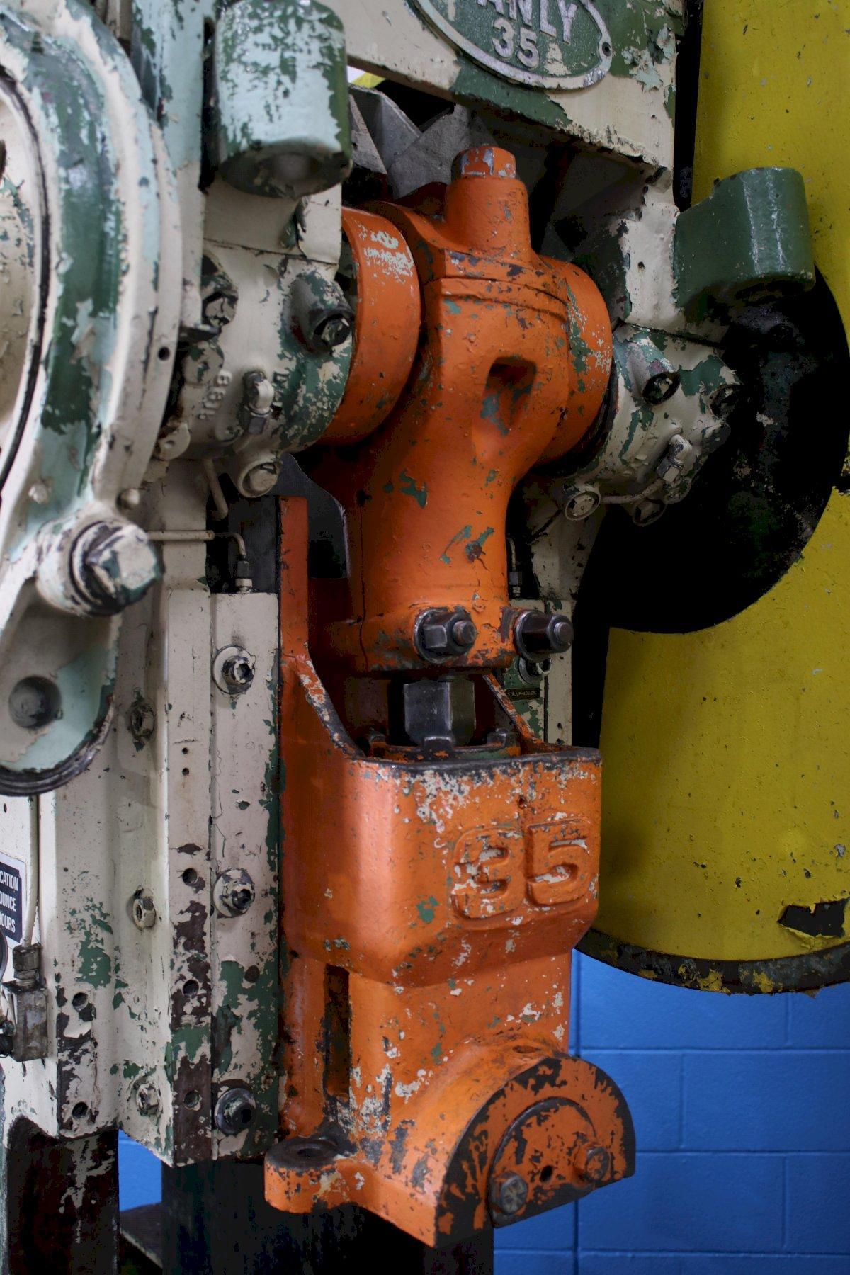 SERIAL .......................... 3558250273 MODEL ........................... 35 CAPACITY ........................ 35 TON STROKE OF SLIDE ................. 4" SLIDE ADJUSTMENT ................ 2-1/4" SHUT HEIGHT, SDAU ............... 12-1/2 AREA OF BED ..................... 24" X 15" AREA OF SLIDE ................... 15" X 10' STROKES PER MINUTE .............. 90 WIDTH OF HOLE THROUGH BACK ...... 11-3/4" DEPTH OF THROAT ................. 8-1/4" BOLSTER ......................... YES AIR CLUTCH AND AIR BRAKE ........ YES FLYWHEEL TYPE ................... YES MOTOR, HORSEPOWER ............... 5 |