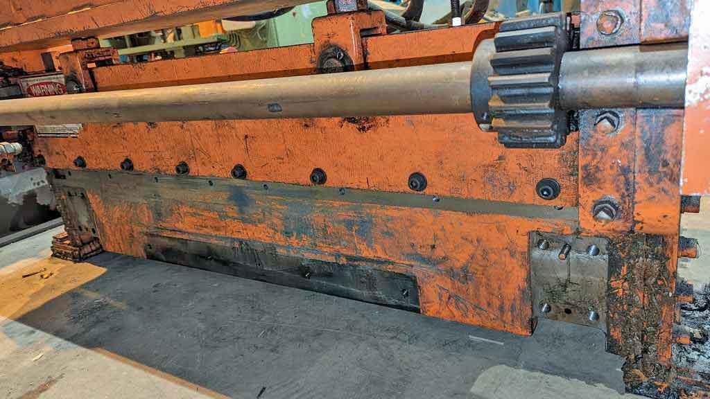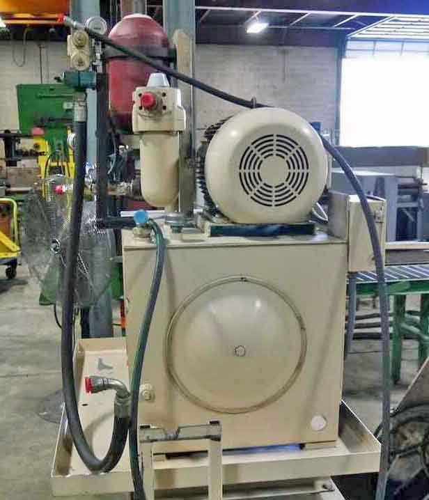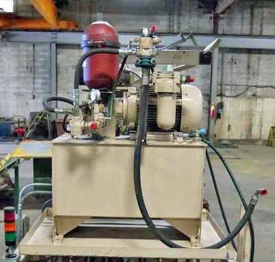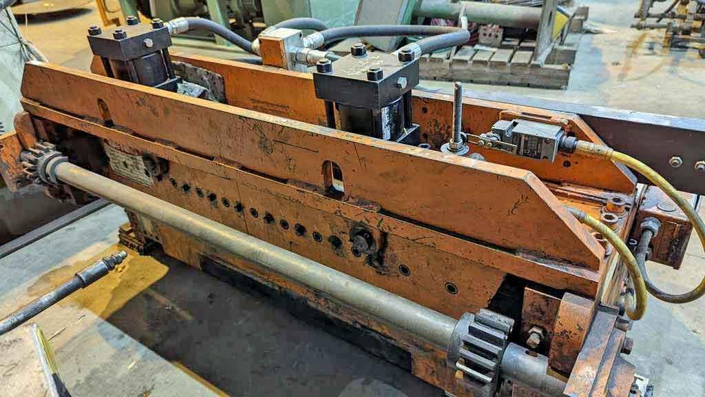 -Material Thickness: 0.036" Maximum, 0.015" Minimum -Maximum Yield: 35,000 psi -Four (4) side high carbon - high chrome shear blades, upper bowtie, lower straight rake blade. -Strokes Per Minute: 70 (40 Cuts Per Minute) -Shear ram actuated through two (2) heavy duty hydraulic cylinders and rides on replaceable bronze wear plates. -Rack & Pinion Shear Ram Design. -Hardened roller type entry guide assembly is mounted on shear and includes a +/- 1/2" lateral micro-adjustment with center indicating position pointer. This single point adjustment allows for slight off-center positioning of the incoming strip. Guides are adjusted relative to centerline through left and right hand acme screw arrangement with a hand wheel. |