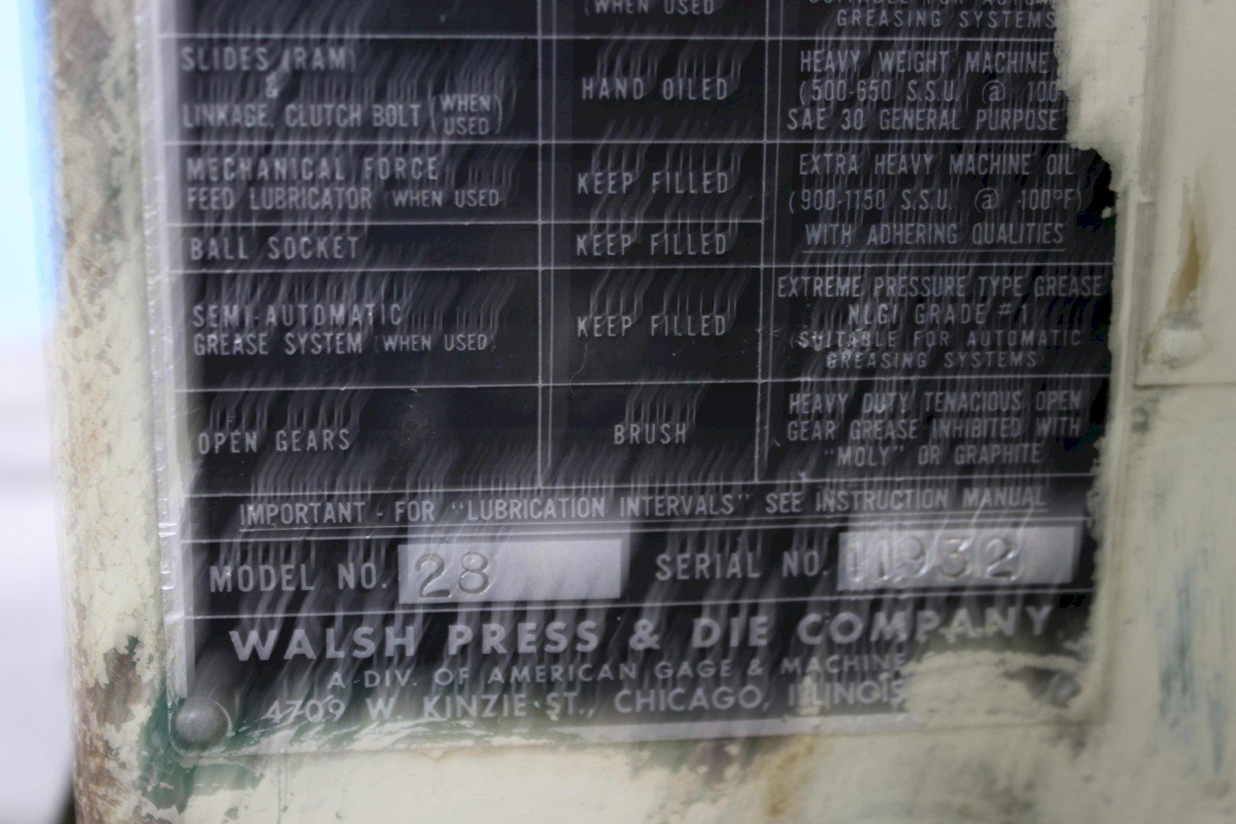SERIAL ......................... 11932 MODEL .......................... 28 CAPACITY ....................... 28 TONS STROKE ......................... 2-1/2" SHUT HEIGHT ON BED (SDAU) ...... 7-1/4" ADJUSTMENT ..................... 2" STROKES PER MINUTE ............. 110 TO 330 BED AREA ....................... 21-3/4" X 12" RAM AREA ....................... 12-1/2" X 8-3/4" THROAT ......................... 6" OPENING THRU BACK .............. 9-1/2" CLUTCH & BRAKE ................. AIR DUAL PALM BUTTONS .............. YES CONTROLS ....................... INCH-SINGLE-CONTINUOUS BRAKE MONITOR .................. LINK-LOGIC LUBE SYSTEM .................... MODULAR DRIVE TYPE ..................... FLYWHEEL MAIN MOTOR ..................... 2 HORSEPOWER |