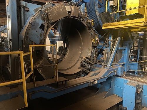 GENERAL SPIRAL MILL SPECIFICATIONS: MANUFACTURER - PWS (SMS) YEAR - 2009 TYPE - 2-STEP SUBMERGED-ARC WELDED HELICAL (SAWH) PIPE DIAMETER - 24" - 60" (610-1524MM) STRIP WIDTH - 39" - 72" (1000-1850MM) WALL THICKNESS RANGE - " - 1" (6-25MM) MAX COIL WEIGHT - 45 TON PIPE LENGTH - UP TO 80' MAX GAUGE - API X-80 YIELD STRENGTH - 560 N/mm2 PIPE LENGTH - 383" - 958" (9750-24400MM) PIPE WEIGHT - 2072 LBS (940KG/M) MAX COIL OUTSIDE DIAMETER - 28" - 30" (720-780MM) FORMING ANGLE - 45 - 80 DEGREES STRIP FEED SPEED - 0.5 - 10 M/MIN TACK WELDING SPEED - 2.0 - 10M/MIN ANNNUAL TONNAGE CAPACITY - 250,000 TOTAL SQUARE FOOTAGE - 230,000 STATUS - INSTALLED IN PLANT GENERAL SPIRAL MILL COMPONENT DESCRIPTIONS: COIL PREP STATION: V-TYPE COIL STAND OPENING DEVICE COIL PREP STAND WITH PLASMA TORCH SPIRAL MILL ENTRY: ENTRY TRAVERSING COIL CAR COIL BOX UNCOILER STAND EDGE SENSORS TWO-ROLL AUXILIARY DRIVE UNIT W/ STRIP CENTERING CONTROL (2) 48 Kw DRIVE MOTORS 14" (380MM) DIAMETER ROLLS SEVEN ROLL FLATTENER 13" (340MM) DIAMETER ROLLS HYDRAULIC STRIP CENTERING DEVICE TWO-PART STRIP CLAMPING DEVICE ONE MOVEABLE SECTION & ONE STATIONARY SECTION SHEAR-END WELD WELDING, CROSS CUTTING & CROSS MILLING STATION W/ SCRAP CARRIAGE TABLE ULTRASONIC SKLEP TESTING: SEVEN HEAD SKELP UT TESTING W/ AUDIBLE, VISUAL AND SPRAY MARKING ALERTS STRIP MILLING SECTION: THREE HYDRAULICALLY CONTROLLLED HORIZONTAL STRIP GUIDE UNITS THREE STRIP EDGE MILL ASSEMBLIES - TWO MILLING HEADS PER ASSEMBLY EACH ASSEMBLY DRIVEN SEPARATELY BY 110 kW DC MOTOR 2-ROLL MAIN DRIVE PINCH ROLL STAND 21" DIAMETER (540MM) DRIVEN SEPARATELY BY 152 kW MOTORS SPIRAL PIPE FORMING SECTION: STRIP EDGE PREBENDING UNIT TWO - THREE ROLL PRE-BEND ASSEMBLIES SPIRAL FORMING ASSEMBLY THREE FORMING ROLL BANKS & OUTSIDE CAGE DEVICE MAG WELDING HEAD FORMING RATE 40' PER MINUTE CONTINUOUS WELD SEAM & TACK WELDING PIPE CUTOFF STATION: TRAVEL ROTARY PLASMA CUTOFF STATION W/ PIPE CLAMPING DEVICE POST SPIRAL PIPE FORMING STATIONS: PIPE IDENTIFICATION STENCILING TRAVELING ROTATING WIRE BRUSH CLEANING STATION W/ VACCUUM UNIT FRONT & END TAB PREP & WELDING STATION FOUR FINAL SUBMERGED-ARC WELDING STATIONS CONSISTING OF: THREE INTERNAL WIRE ID WELDING TORCHES TWO EXTERNAL WIRE OD WELDING TORCHES COMPUTERIZED ALIGNMENT TRACKING ID/OD WELD SEAM REAL-TIME ELECTRONIC TRACKING OF WELD PARAMETERS PRECISE CONVEYANE OF THE PIPE UNDER THE WELDING HEADS TEST RING REMOVAL/CUTTING FOR OFFLINE INSPECTION TAB PLATE REMOVAL HYDROSTATIC TESTING UNIT 5000 PSI MAX 80' MAX LENGTH AUTOMATED ULTRASONIC SHEAR WAVE & HEAT AFFECTED ZONE INSPECTION LASER TRACKING OF THE WELD SEAM, PHASE ARRAY ULTRASONIC TESTING, PIPE CONVEYORS AND POSITIONING AUTOMATED AUDIBLE, VISUAL AND SPRAY MARKING ALERTS DYAMIC AND STATIC CALIBRATION PROCESSES ARE UTILIZED X-RAY DIGITAL RADIOGRAPHY PIPE END INSPECTION TOP & END PIPE BEVELING 30-35 DEGREE ANGLE & ROOT FACE OF 1/16" +/- 1/32" VISUAL INSPECTION & PIPE END INSPECTION FINISH MEASSURING FINISH PIPE TALLY & STENCILING PLANT WIDE PIPE CONVEYING SYSTEM - BUILT TO MOVE PIPES BETWEEN ALL THE STATIONS OF THE PROCESS, INCLUDING: ASSOCIATED WELDERS, CONVEYORS, COIL/SPIRAL PIPE STANDS, POWERED URETHANE TURNING ROLLS, HYDRAULIC UNITS, EJECTORS, POWERED & NON POWERED CONVEYORS ASSOCIATED CONTROLS, SOFTWARE, HMI, OPERATORS STANDS, ELECTRICS TO RUN THE EQUIPMENT ALL SPECIFICATIONS ARE FOR REFERENCE ONLY AND MUST BE VERIFED BY PURCHASER. |