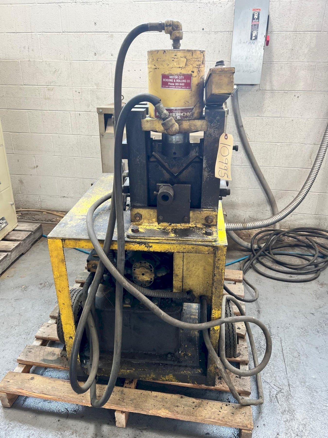 Model: FAS 44 Specifications: Tonnage: 35 tons Maximum stroke: 2-1/8" Cycle time: 6 seconds Angle capacity: 4" x 4" x 3/8" Voltage: 220 / 440 volt 3 phase Weight: 400 lbs. Equipped with: Portable stand Hydraulic unit |