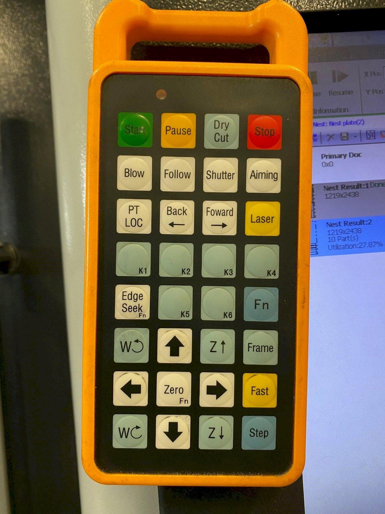 Model: HF3015B Specifications: X-axis travel: 59" (1,500mm) Y-axis travel: 118" (3,000mm) Z-axis travel: 9.4" (240mm) X/Y axis max speed: 5,511 IPM (140m/min) Max work load: 2,200 Lbs. (1000kg) Max. cutting capacity: Stainless steel: .393" (10mm) Aluminum: .393" (10mm) Brass: .236" (6mm) Carbon steel: .787" (20mm) Machine weight: 18,700 Lbs. (5800kg) Equipped with: 3,000 watt Hymson Max MFMC fiber optic laser generator Dual end load shuttle tables Handheld pendent control 30 watt marking system Nesting software Part framing Machine enclosure Chiller Transformer Pull out scrap trays Spare parts *Dust collector not included* Sold As-Is Where-Is |