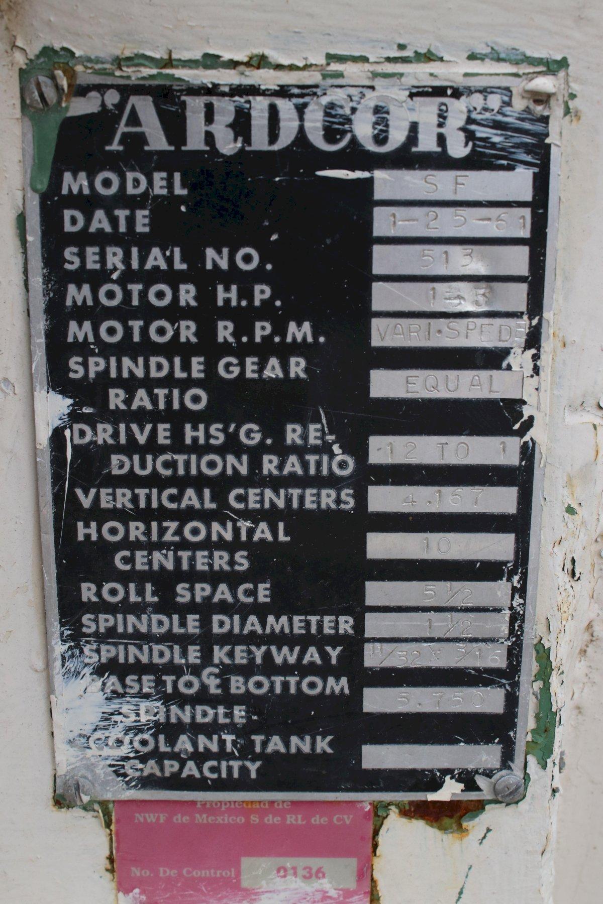 SERIAL ....................... 513 MODEL ........................ SF YEAR ......................... 1961 LEFT TO RIGHT ................ YES STANDS ....................... 12 SHAFT DIAMETER ............... 1-1/2" HORIZONTAL CENTERS ........... 10" VERTICAL CENTERS ............. 4.167" ROLL SPACE ................... 5-1/2" BASE TO BOTTOM SPINDLE ....... 5-3/4" SPINDLE GEAR RATIO ........... EQUAL VARIABLE SPEED DRIVE ......... YES MOTOR ........................ 15 HORSEPOWER |
