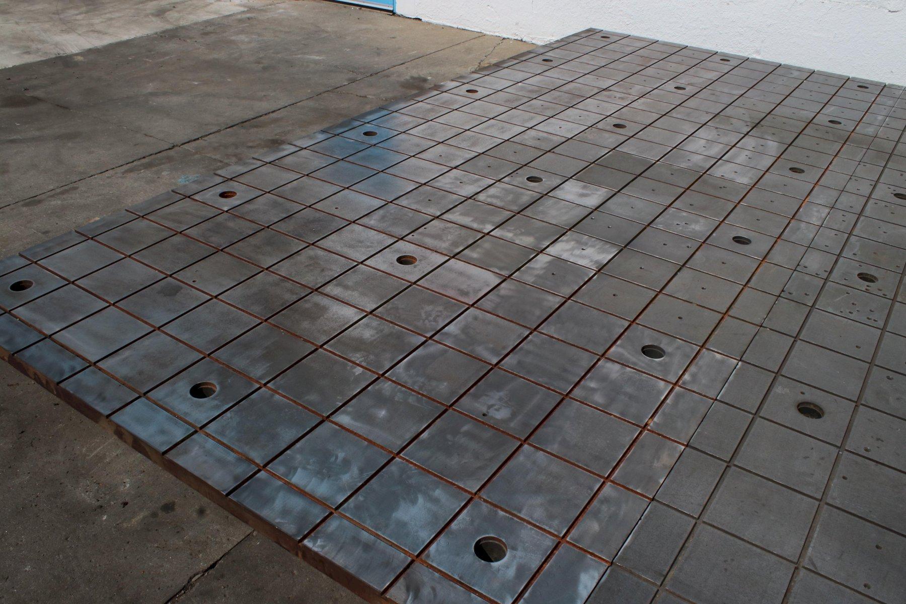 LENGTH OF PLATE ............. 178" WIDTH OF PLATE .............. 78-3/4" HEIGHT OF PLATE ............. 9" GROOVES WIDTH DIRECTION ..... 21 GROOVES LENGTH DIRECTION .... 10 GROVE CENTER ................ CAST IRON CONSTRUCTION ....... YES SEE STOCK 76745 TO MAKE PLATE 178" X 157" |