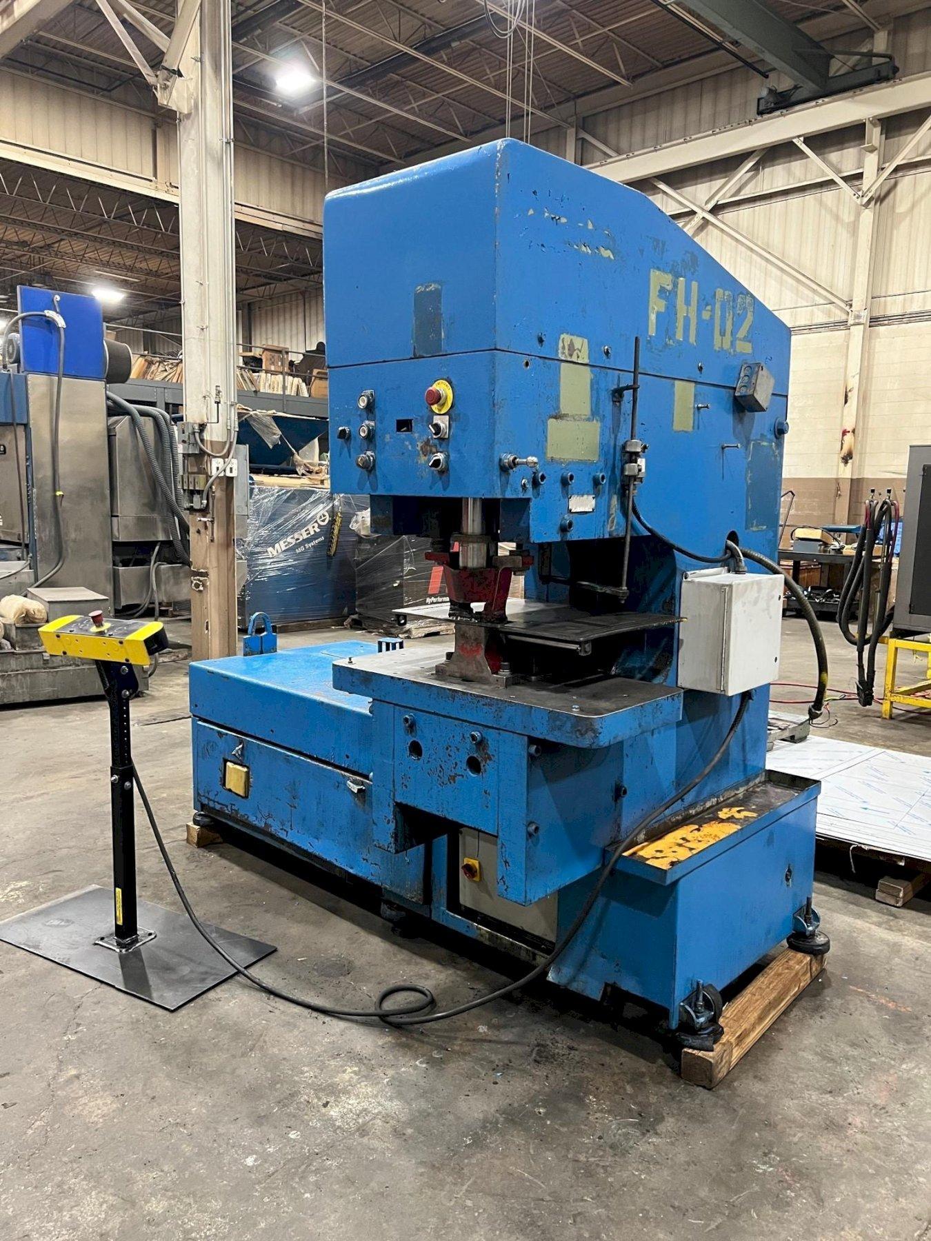 Model: SEPP-140 Specifications: Tonnage: 140 tons Throat depth: 20.5" Platen size: 36" x 16" Open height: 14" Closed height: 7-3/4" Stroke length: 7" Strokes per minute: 24 @ 1" Main motor: 20 H.P. Voltage: 220 / 440 volt 3 phase (currently wired 440 volt) Dimensions: 93" x 51" x 85" Weight: 7,800 Lbs. Equipped with: Structural die block Punch stripper Stroke control Self contained hydraulic system Joystick control |