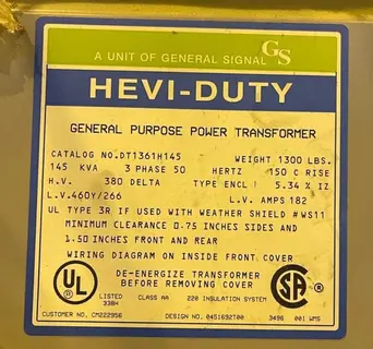 3 Phase Transformer Capacity: 145 KVA HV: 380 V LV: 460Y / 266 HZ: 50 % Imp: 5.34% at 150 Deg. C Total Weight: 1,300 lbs. Catalog Number: DT1361H145 In Storage: Toledo, OH. |