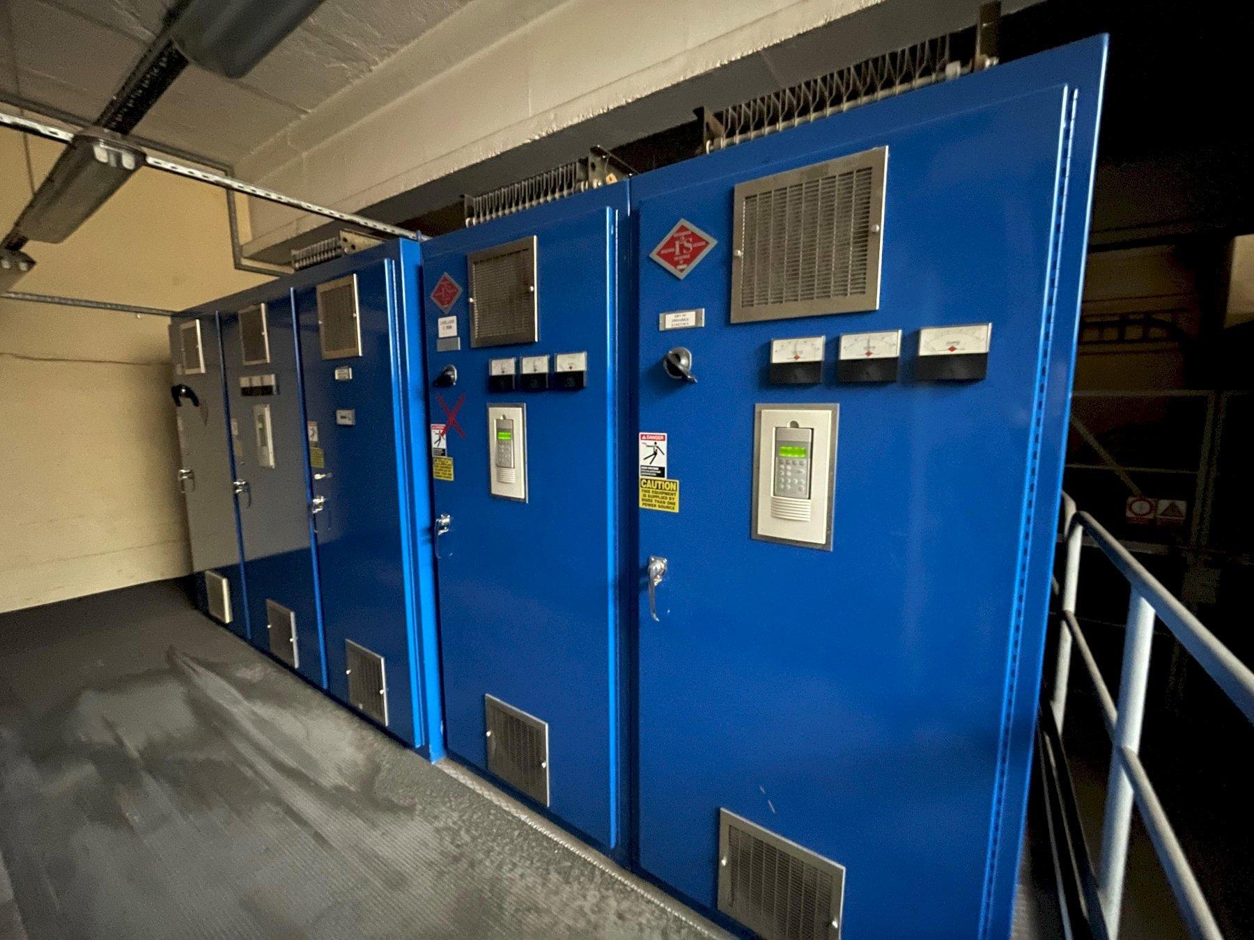 Stock # 14214 Sendzimir rolling mill Characteristics of the Sendzimir rolling mill type ZR23-25: Input tape thickness range 0.05-3.5 mm Rolled strip width range 280-625 mm Rolling speed 1st gear - 0-165 m/min 2nd gear - 0-280 m/min 2nd gear - 0-280 m/min Diameter of backing rollers ø 225 mm Diameter range of second row backing rollers ø 124-131 mm Diameter range of first row backing rolls ø 65-78 mm Diameter range of working rolls ø 32-48 mm Diameter of scrolling drums ø 609 mm coil diameter after winding on the drum ø 1825 mm Uncoiling drum diameter ø 400 mm, ø 600 mm Winding drum diameter ø 400 mm, ø 600 mm Tension and counter-pull force 1st gear - max 16,600 kg (at 165 m/min) 2nd gear - max 9,750 kg (at 280 m/min) Mill drive motor 600 HP, 230/700 rpm - 450kW/DC (500V, 1035A) Left drum motor 600 HP, 400/1200 rpm - 450kW/DC (480V, 1030A) Right drum motor 600 HP, 400/1200 rpm - 450kW/DC (480V, 1030A) Winder motor in front of the rolling mill (decoiler) 60 HP, 400/1600 rpm - 45kW/DC (250V, 205A) Rewinder motor before rolling mill 200 HP, 300/900 rpm - 150kW/DC (250V, 665A) Rewinder motor behind the rolling mill (decoiler) 200 HP, 300/900 rpm - 150kW/DC (250V, 665A) Rewinder motor after rolling mill 20HP, 650/2000 rpm - 15kW/DC (240V, 72A) Control system Visualization on a DOS computer Roll setting control system implemented by a PC computer equipped with specialized cards SAF controller - controlling drives for optical fiber GE FANUC controller - IC697CPX782 with islands - rolling mill control **Temporary Specifications Subject to Revisions** **PRICE QUOTED AS IS WHERE IS SUBJECT TO PRIOR SALE** **ALL SPECIFICATIONS ARE SUBJECT TO PRIOR SALE** |