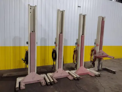 MODEL .................. ST-1072 TOTAL NUMBER OF JACKS .. 4 JACK CONFIGERATION ..... 1 MASTER, 3 SLAVES OPERATING MODES ........ SINGLE, PAIR, ALL CAPACITY ............... 16,000 LBS EACH TOTAL CAPACITY ......... 64,000 LBS MAX LIFT HEIGHT ........ 68-7/8" LIFTING SPEED .......... 50" PER MIN LIFTING TIME ........... 83 SECONDS LOWERING TIME .......... 60 SECONDS LOWERED COLUMN HEIGHT .. 113" RAISE HEIGHT ........... 143" MAX WIDTH OF FRAME LEGS .... 44" LIFTING FORKS .......... 12" WIDE X 22" CENTER TO CENTER PORTABLE ............... WHEELED BASES |