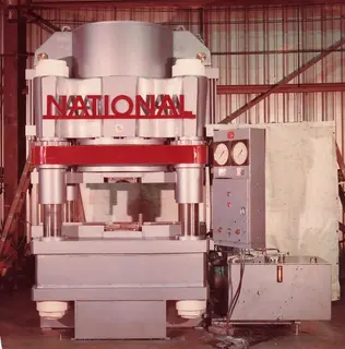 US NAVY REBUILD ............ 1991 NAVY PACKED & STORED ....... 2013 MODEL ...................... 300T TONNAGE CAPACITY ........... 3000 TON SWAGING CAPACITY: SWAGE SOCKETS .............. 3" STANDARD SLEEVES ........... 4" HEAVY DUTY SLEEVES ......... 1-1/8" DUPLEX STEEL SLEEVES ....... 1" ALUMINUM DUPLEX SLEEVES .... 1-1/2" STROKE OF RAM .............. 13-1/2" FLOOR TO PLATEN (MINIMUM) .. 38-1/2 MIN DAYLIGHT BETWEEN PLATENS ... 27.62" LENGTH BETWEEN COLUMNS ..... 48" L-R, 28" F-B CONTROL STATION ............ YES OIL RESERVOIR .............. 145 GALLONS HYDRAULIC UNIT & PUMP ...... RACINE HYDRAULICS HYDRAULIC PUMP MOTOR ....... 45 HP Features of National Hydraulic Swaging Machines offer a number of advantages for high production sling shops: