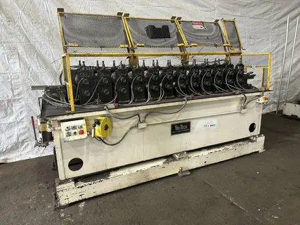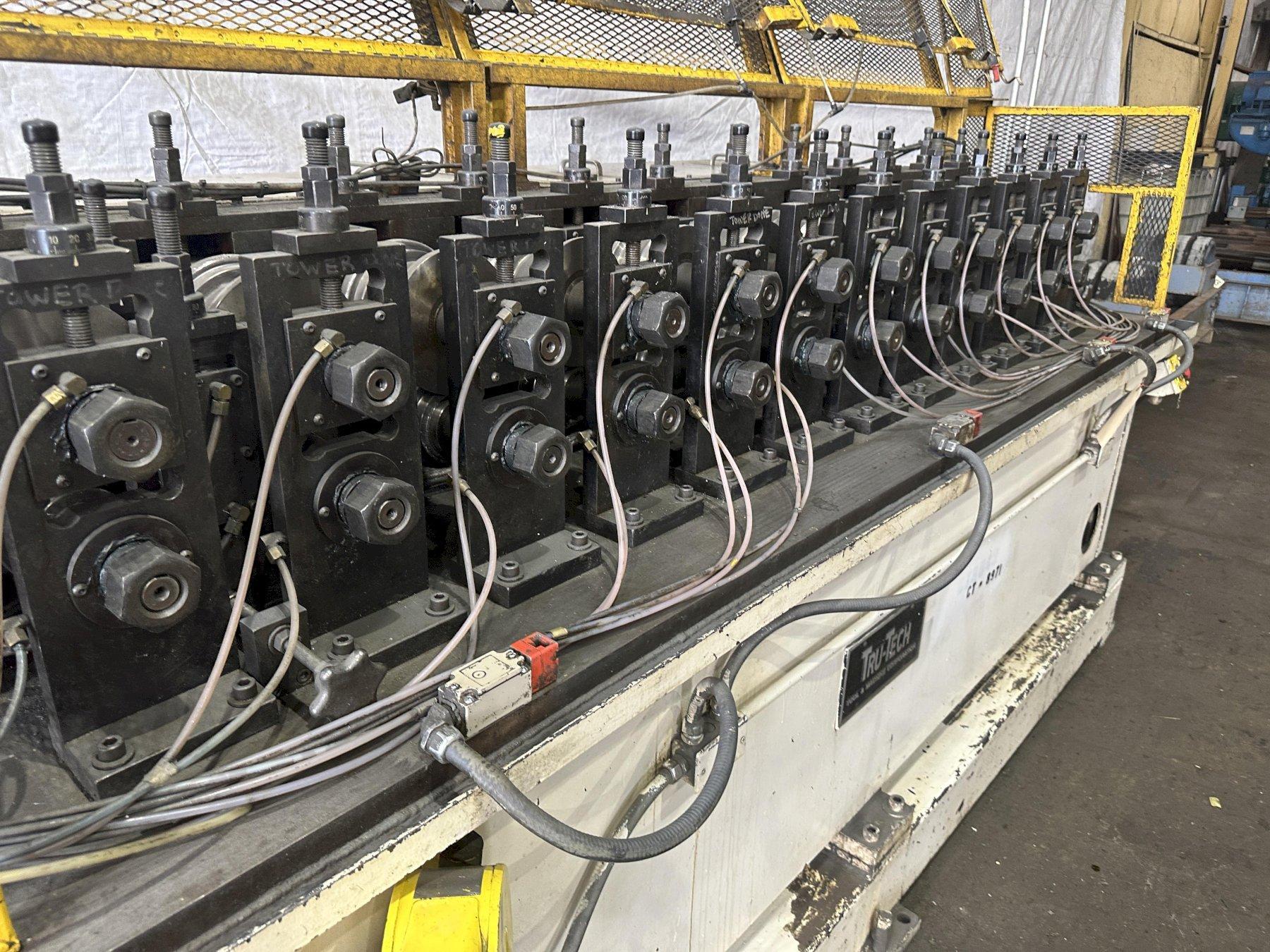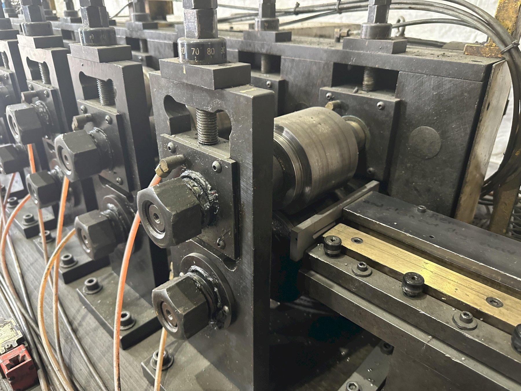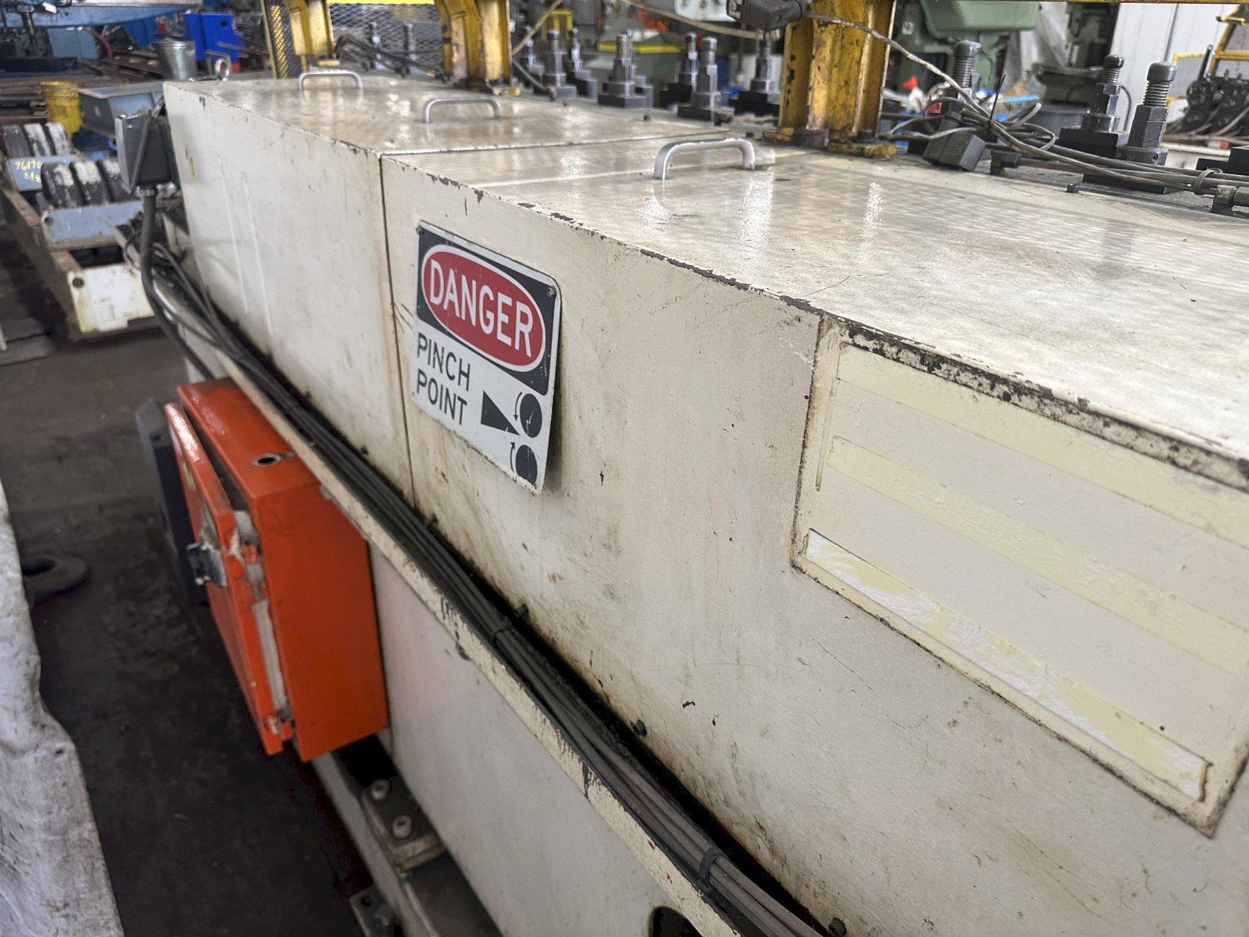 NUMBER OF STANDS .................... 12 DIAMETER OF SHAFTS .................. 2" ROLL SPACE .......................... 8" HORIZONTAL CENTERS .................. 8" BASE TO CENTER OF LOWER SHAFT ....... 6" VERTICAL ROLL ADJUSTMENT ............ 2" SPEED VARIABLE ALLEN BRADLEY ........ 1336 PLUS FORWARD AND REVERSING ............... YES LUBE SYSTEM ......................... YES JOGGING ............................. YES MOTOR ............................... 10 HORSEPOWER |