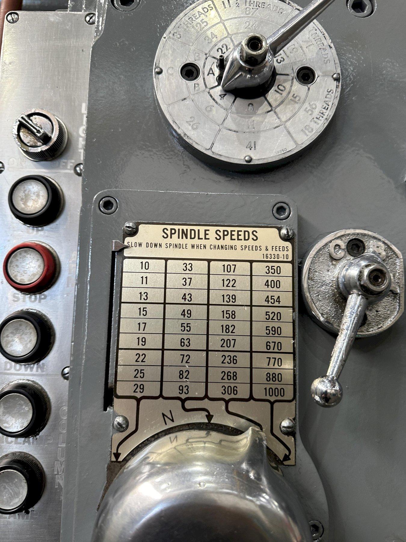 SERIAL ............................... 5A-5826 MODEL ................................ 5A SPINDLE SPEEDS ....................... (12) 10 TO 1000 RPM THREADS .............................. (5) 6, 7, 8, 11-1/2, 18 DISTANCE SPINDLE TO FLOOR ............. 18-1/2" MIN, TO 98" MAX SPINDLE TRAVEL ....................... 24" TAPER IN SPINDLE ..................... #6 MT DIAMETER OF SPINDLE .................. 4" TRAVEL OF ARM ON COLUMN .............. 54" TRAVEL OF HEAD ON ARM ................ 105" POWER HEAD CLAMPING .................. YES POWER HEAD TRAVERSE .................. YES POWER ELEVATION ...................... YES SPINDLE MOTOR ........................ 40 HORSEPOWER |