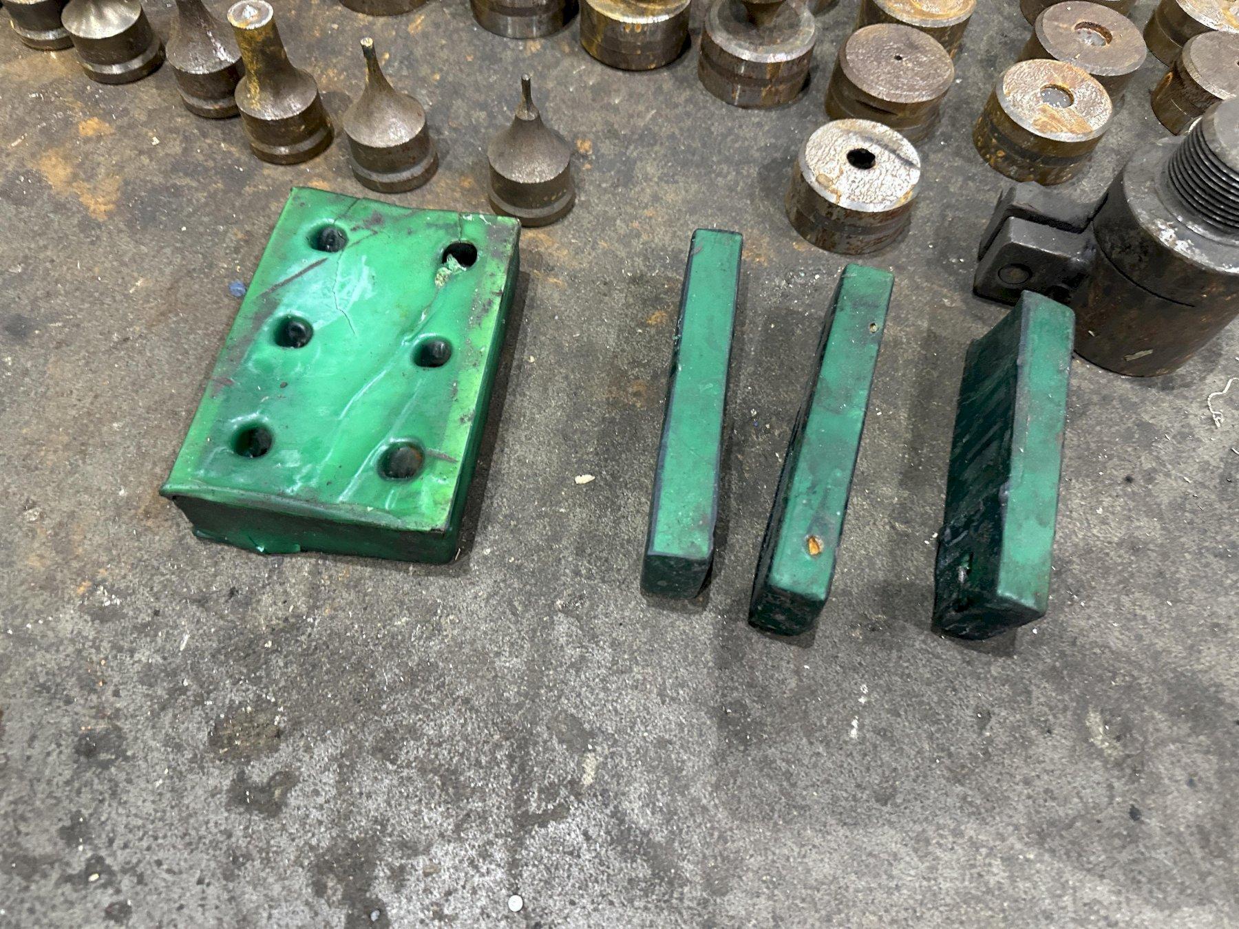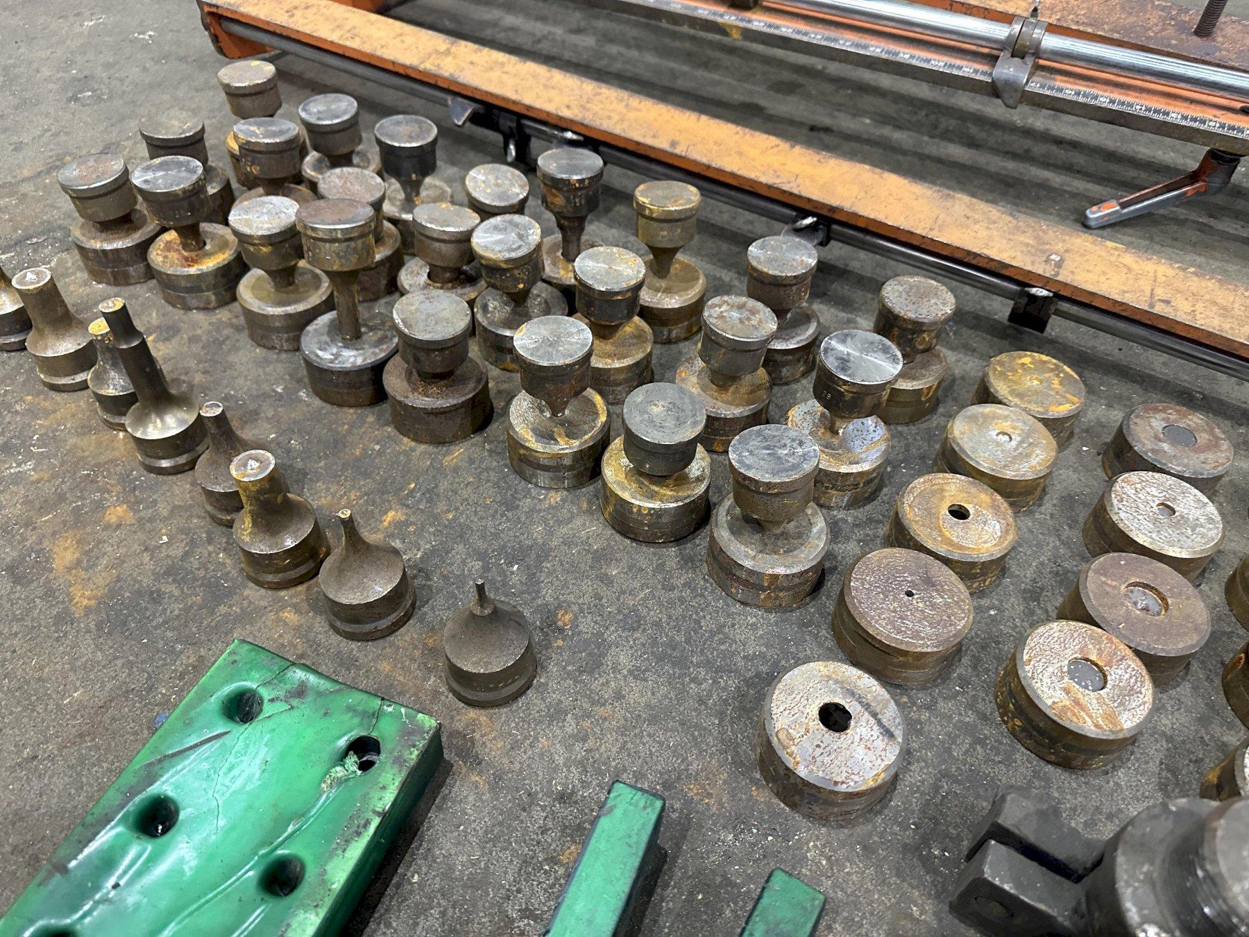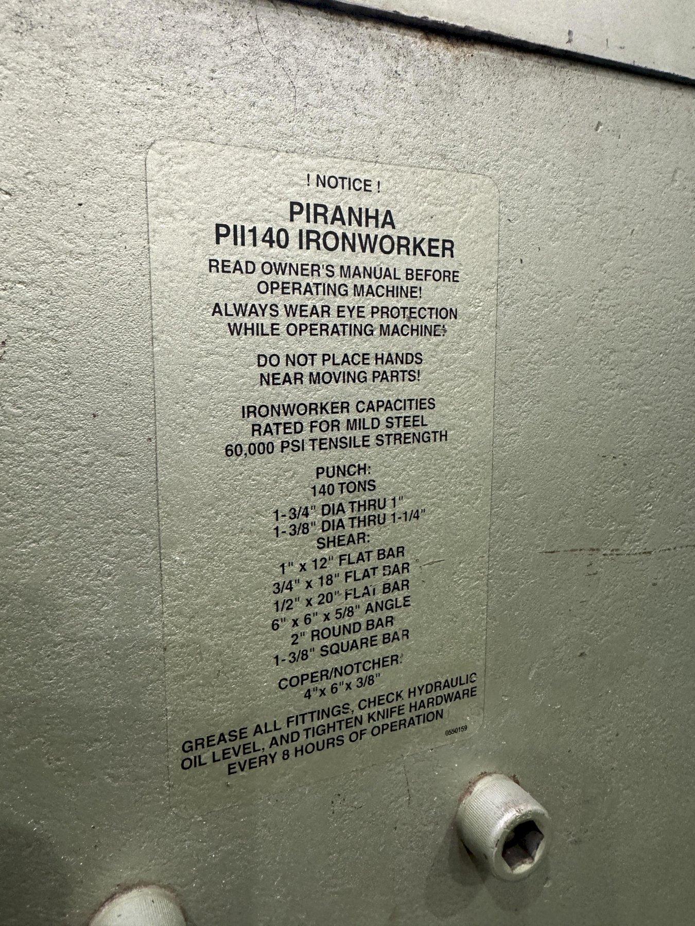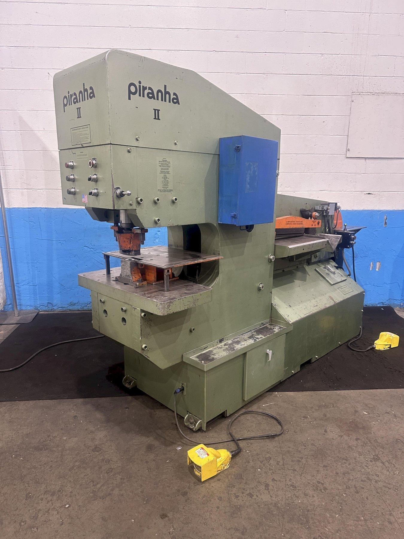 SERAL ................ PII-140-022 MODEL ................................. PII 140 YEAR NEW .............................. 1999 PUNCHING CAPACITY ..................... 140 TONS PUNCH DIAMETER THROUGH PLATE SIZE ..... 1-3/8" THRU 1-1/4" DEPTH OF THROAT ....................... 20-1/2" STROKE ................................ 5-1/4" OPEN HEIGHT ........................... 15-1/2" PLATEN TABLE .......................... 21" X 14-1/2" SHEARING CAPACITY ANGLES .............. 6" X 6" X 5/8" PLATE ................................. 20" X 1/2" PLATE CAPACITY ........................ 14" X 1" ROUNDS ................................ 1/2" TO 2" MAXIMUM SQUARE ................................ 1/2" TO 1-3/8" MAXIMUM STROKES PER MINUTE .................... 40 @ 3/4" COPER - NOTCHER ....................... 4" X 6" X 3/8 JOY STICK CONTROLS .................... YES HORSEPOWER ............................ 20 |