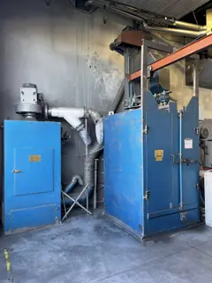Automatic Spinner Hanger Shot Blast Machine Manufacture: Doublestar China Model: Q376 Opening: 42" diameter x 60" tall (Ideal size is 40" x 40") Footprint: 12' wide x 10' deep x 13-1/2' tall Spinner hanger hook: 1 rated for 1,320 lbs, rotating speed is 2.8 r/min Blast cabinet wear plates: 65Mn Blastwheels: 2 - 10HP blastwheels with a diameter of 16.535" (420mm). This blastwheel is a simple proven design and it's a workhorse. The blastwheel assembly is dynamically balanced, direct drive with a double disk design (each disk is over 3/4" thick), and straight blades Abrasive flow rate: 264 lbs/min each wheel x two = 528 lbs/min total Velocity: 250 ft/sec Media cleaning/recycling system: bucket elevator with airwash separator Initial media charge: 1,100 lbs Electric control system: control panel with PLC, 460V, 3 phase, 60 Hz