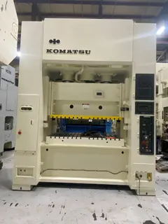 Used Komatsu Metal Stamping Press Model E2M200 sn/ 10053 200-ton Metric Capacity 220-ton US Capacity (Short) 5.9" Stroke 24.8" Shut Height on Bed 17.7" Die Height on Bolster 3.9" Motorized Adjustment 72.8" LR x 35.4" FB Slide Area 72.8" LR x 43.3" FB Bed Area 20-100 VSPM Equipment and Features Hydraulic Clutch and Brake Air Counterbalances Recirculating Lube System T-Slotted Ram and Bolster Komatsu Press Controls Light Curtains Hydraulic Overload Protection Plunger Guided to maintain parallelism and horizontal accuracy of slide for extends die life. Unitized Frame of Cast Steel Construction T-Stand Palm Button Station 8 Point Gibs 7.1" Thick Bolster Plate 25.6" Wide WIndows (to be confirmed) Vibro Dynamic Isolation Pads Floor Standing This used 200-ton Komatsu Metal Stamping Press can be seen under power in the S&G Press Livonia Warehouse! Click here for more 200-ton Press Options This used Komatsu E2M200 offers 220 US tons of stamping power with a 5.9" stroke and variable speeds up to 100 SPM. Its large bed and slide areas accommodate sizable dies. Features like hydraulic overloads and a robust build make it suitable for diverse blanking and progressive die stamping applications