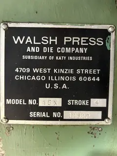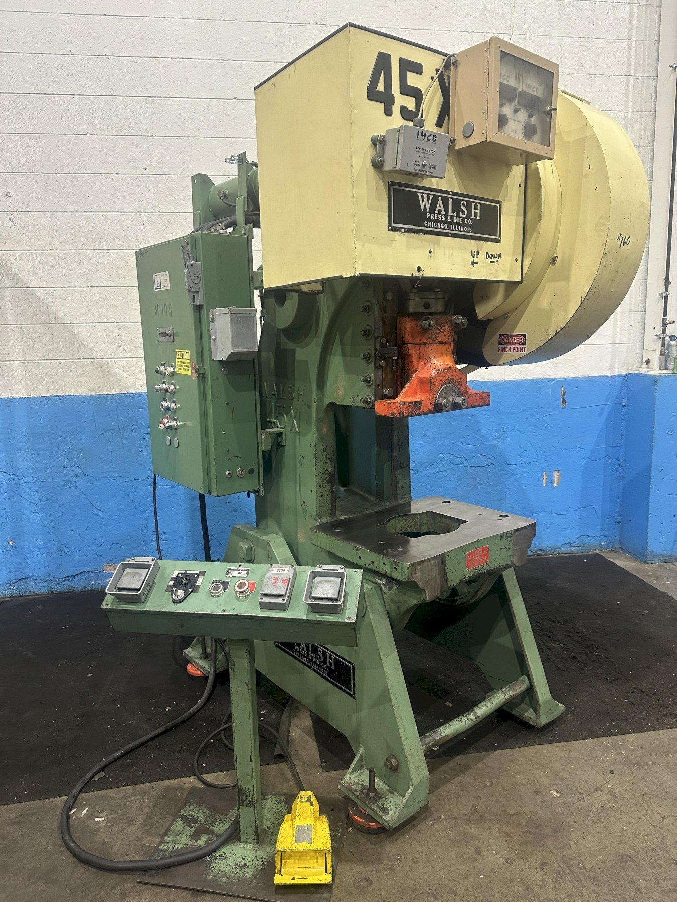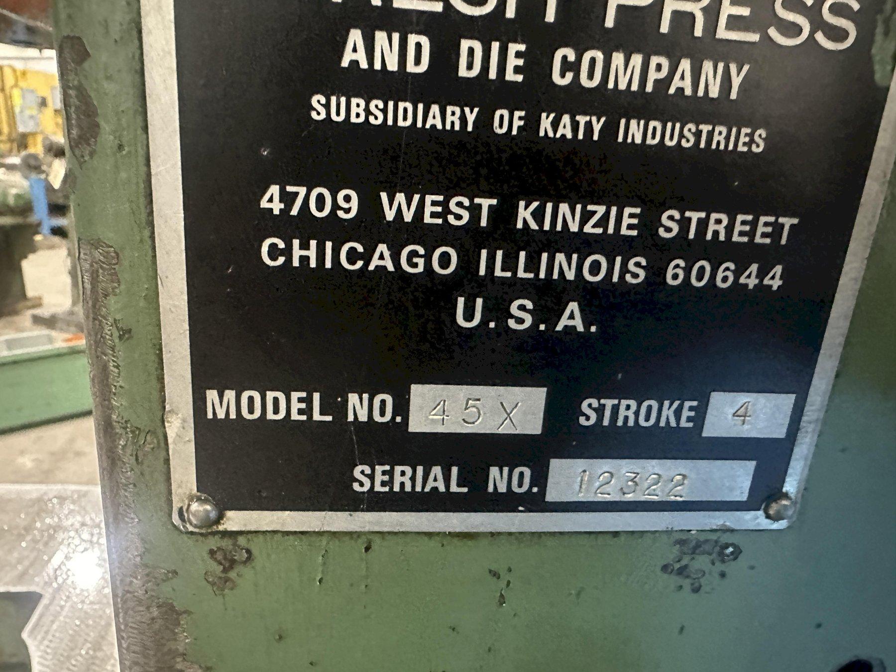 SERIAL ......................... 12322 MODEL .......................... 45X NEW ............................ 1981 CAPACITY ....................... 45 TONS STROKE ......................... 4" SHUT HEIGHT ON BED (SDAU) ......11" ADJUSTMENT ..................... 2-1/2" STROKES PER MINUTE ............. 90 BED AREA ....................... 32-1/4" X 18-1/2" RAM AREA ....................... 14" X10-7/32" THROAT ......................... 12" OPENING THRU BACK .............. 2 CLUTCH & BRAKE ................. AIR DUAL PALM BUTTONS .............. YES CONTROLS ....................... INCH-SINGLE-CONTINUOUS LUBE SYSTEM .................... YES DRIVE TYPE ..................... FLYWHEEL MAIN MOTOR ..................... 3 HORSEPOWER |