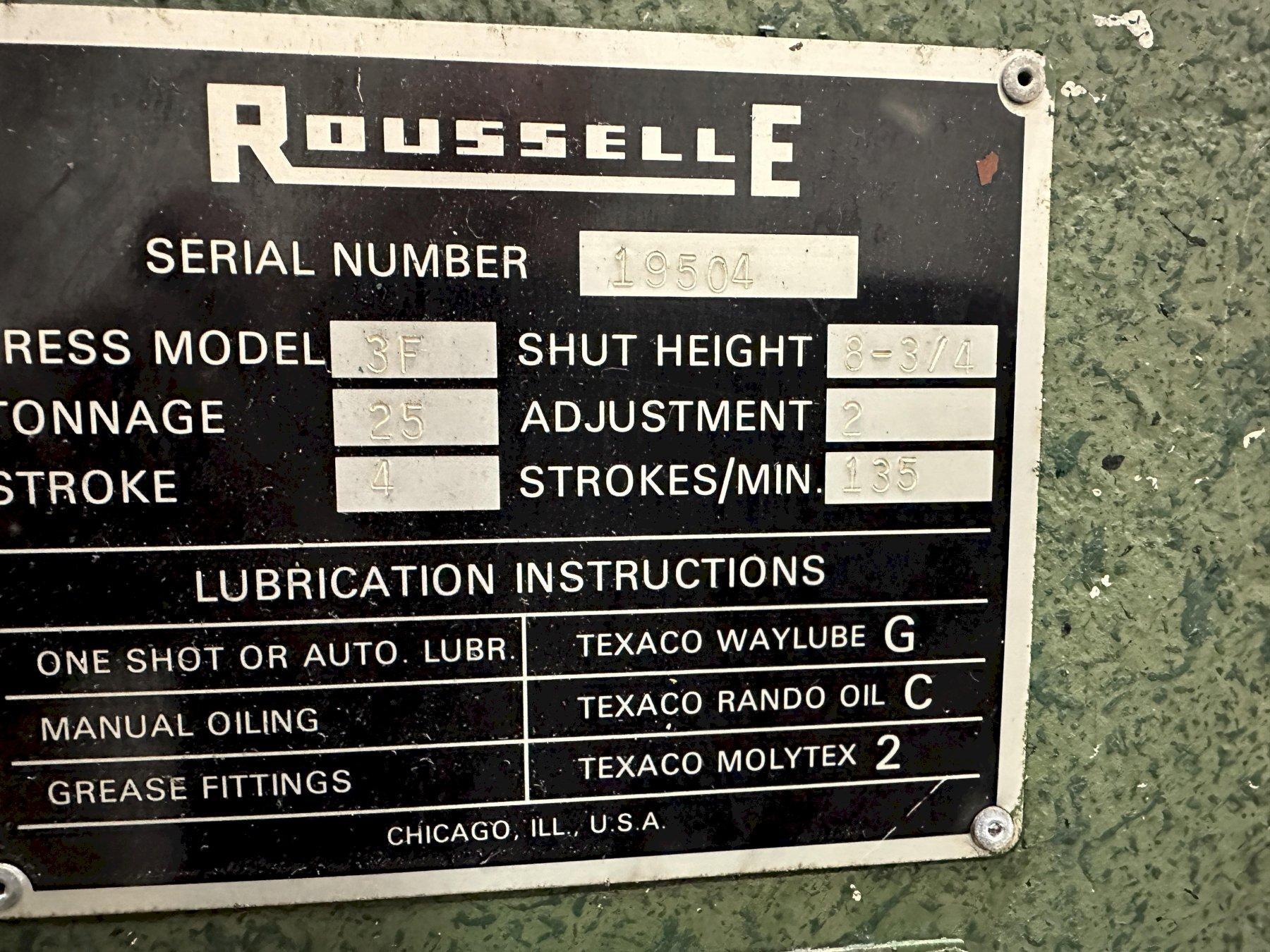 SERIAL ....................... 19504 MODEL ........................ 3F CAPACITY ..................... 25 TON STROKE OF SLIDE ............. 4" SHUT HEIGHT (SDAU) ........... 10-3/4" SLIDE ADJUSTMENT ............. 2" AREA OF BED .................. 20" X 14" AREA OF RAM .................. 8" X 5-1/2" AREA OF BOLSTER PLATES ....... (2) @ 14" X 20" X 1-1/2" DEPTH OF THROAT .............. 15" WIDTH OF OPENING IN BACK ..... 12" FLYWHEEL ..................... YES STROKES PER MINUTE ........... 135 AIR ACTUATED CLUTCH TRIP ..... YES ELECTRIC FOOT PEDAL .......... YES INCH, SINGLE & CONTINIOUS.. YES MOTOR ........................ 2 HORSEPOWER |