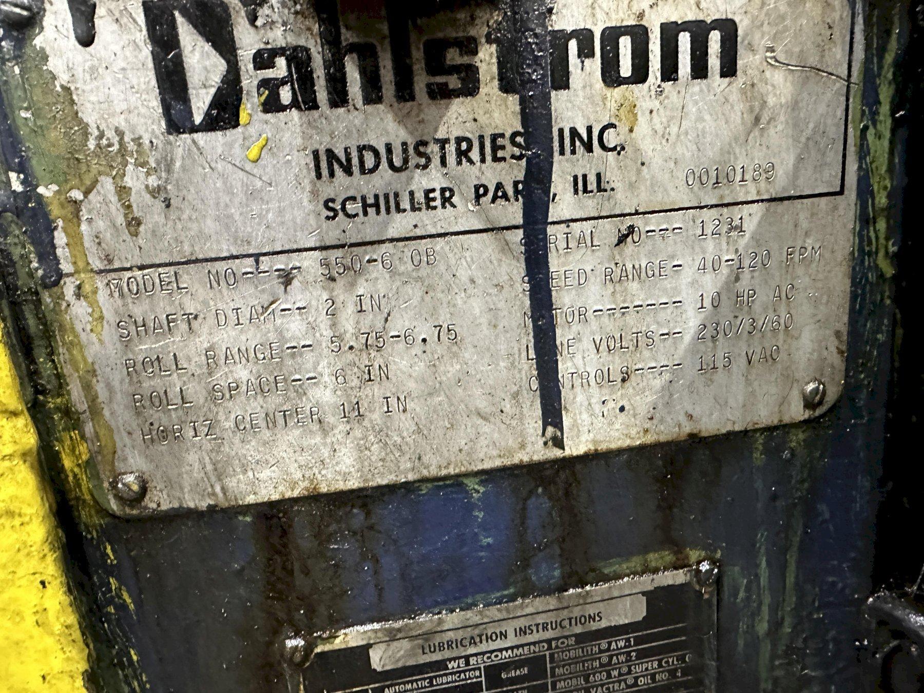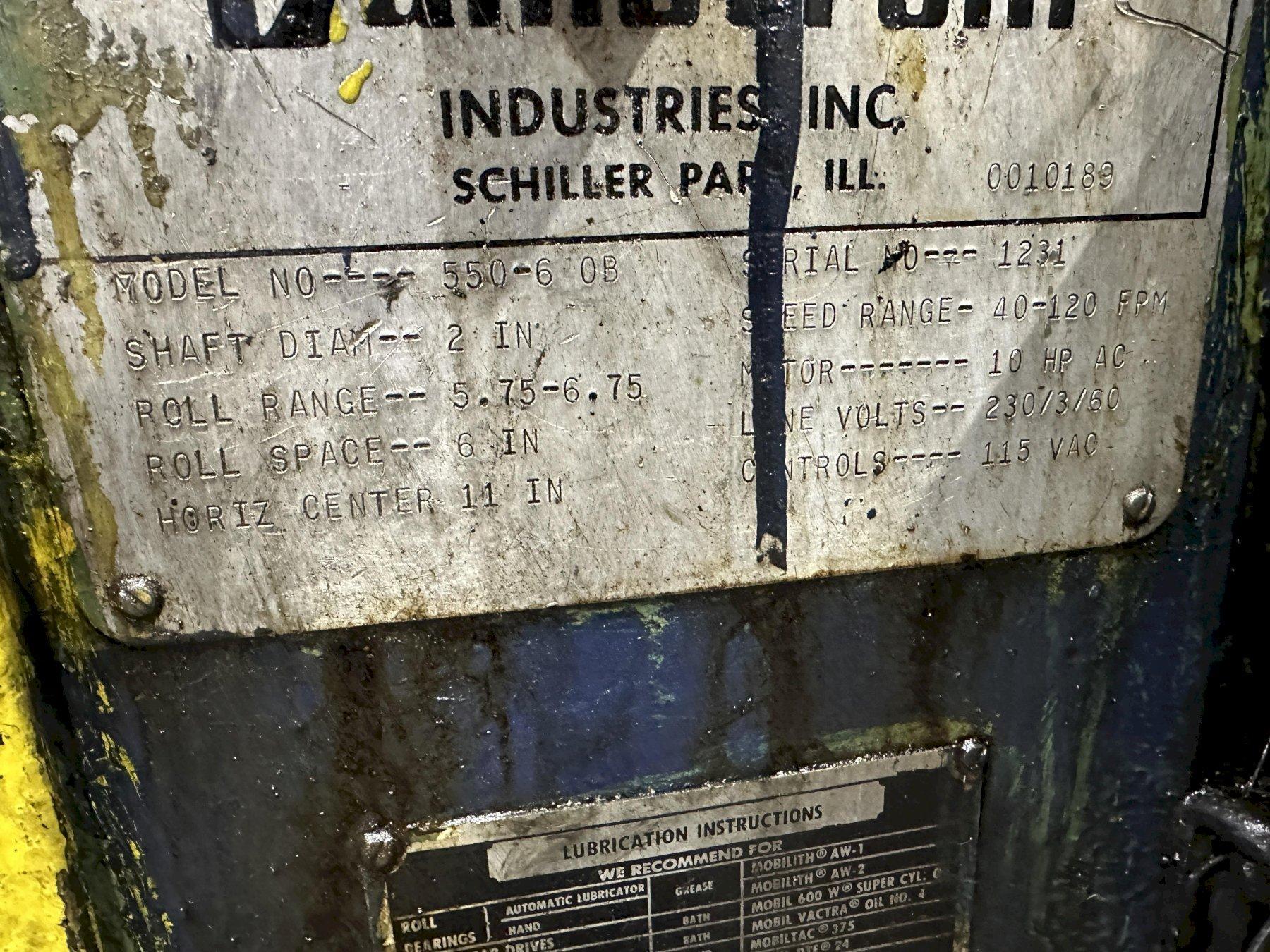 SERIAL ..1231 MODEL .. 550-6-OB NUMBER OF STANDS .. 6 SHAFT DIAMETER .. 2" ROLL RANGE .. 5.75-6.75 ROLL SPACE .. 6" HORIZONTAL CENTER .. 11" SPEED RANGE .. 40 TO 120 RPM MOTOR ..10 HP |