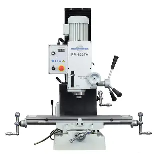 Model: PM-833TVTable Size: 8-1/4×33”Table T Slot Size / Spacing Between: 5/8″ / 2-1/4″X Axis Travel: 21-3/4” MaxY Axis Travel: 11” MaxZ Axis Travel (Head): 17-1/2” MaxMax. Distance, Spindle to Table: 20-1/2” MaxQuill Travel / Diameter:  4-3/4” / 2.952″ (75mm) Leadscrew Type: Precision Ground ACME Leadscrew W/ Backlash Adjustments on X and Y AxisLeadscrew Pitch:  .100” (10 Threads Per Inch)Dial Graduations:  .001”Spindle Taper:  R8Spindle Speed Range:  50-3200 Infinitely Variable (Belt Drive, one step, built in VFD Drive for variable speeds)Speed Change Type: Knob (speed can be changed while running)Spindle Bearing Type: High Precision Tapered Roller Bearings, Fully AdjustableSpindle Bearing Class: C5Main Motor HP: 2 HPOverall Height to reach Maximum top of Z Axis Travel:  88”Height with head at normal working height: 75”Height of Table Working Surface while mounted on optional stand: 39-1/2″Front to back - Rear of Machine to Front of Y Axis Handle: 34-5/8″Chip Tray Size (At top of base):  30″ x  24-1/2″Width X Axis Table Handles, Tip to Tip: 41-3/4”Machine Weight: 750 LBS (Without Stand) 880 (With Stand) (833TV model is lighter than gear head 833T model due to having a belt drive which is lighter, all the gears, shafts, extra bearings, etc in the headstock are not needed with the belt drive, but same body of machine so same rigidity)Main Motor Power:  2HPVoltage / Phase:    220 Volt Single Phase Power (Standard 208V and 240V single phase is fine)Country of Origin: TaiwanWarranty: 5 YearsCord Connection/Type: Cord approx. 5′ length, User to supply plug needed for your outlet (20A 240V With Ground, No Neutral Required) |