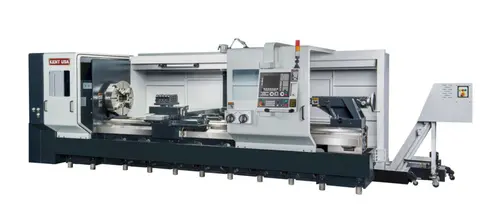 The Kent CNC Heavy Duty Boring Turning Center Series provides 2 excellent configurations for heavy duty turning for large parts. This series is equipped with big hollow bores ideal for large diameter pipe-type work. The Kent CNC Large Bore Turning Center Series features up to 400 inches of bed, 12 inches in spindle bore diameter, and over 15,000 lbs of turning capacity. Designed for rigidity and precision, the Kent CNC large bore turning series can be equipped with up to 35 HP of spindle motor to perform heavy duty cutting and deep hole machining. In addition, this series is equipped with big hollow bores ideal for large diameter pipe-type work. Roller brackets are installed for heavy duty large workpieces with up to 20 inches in diameter.