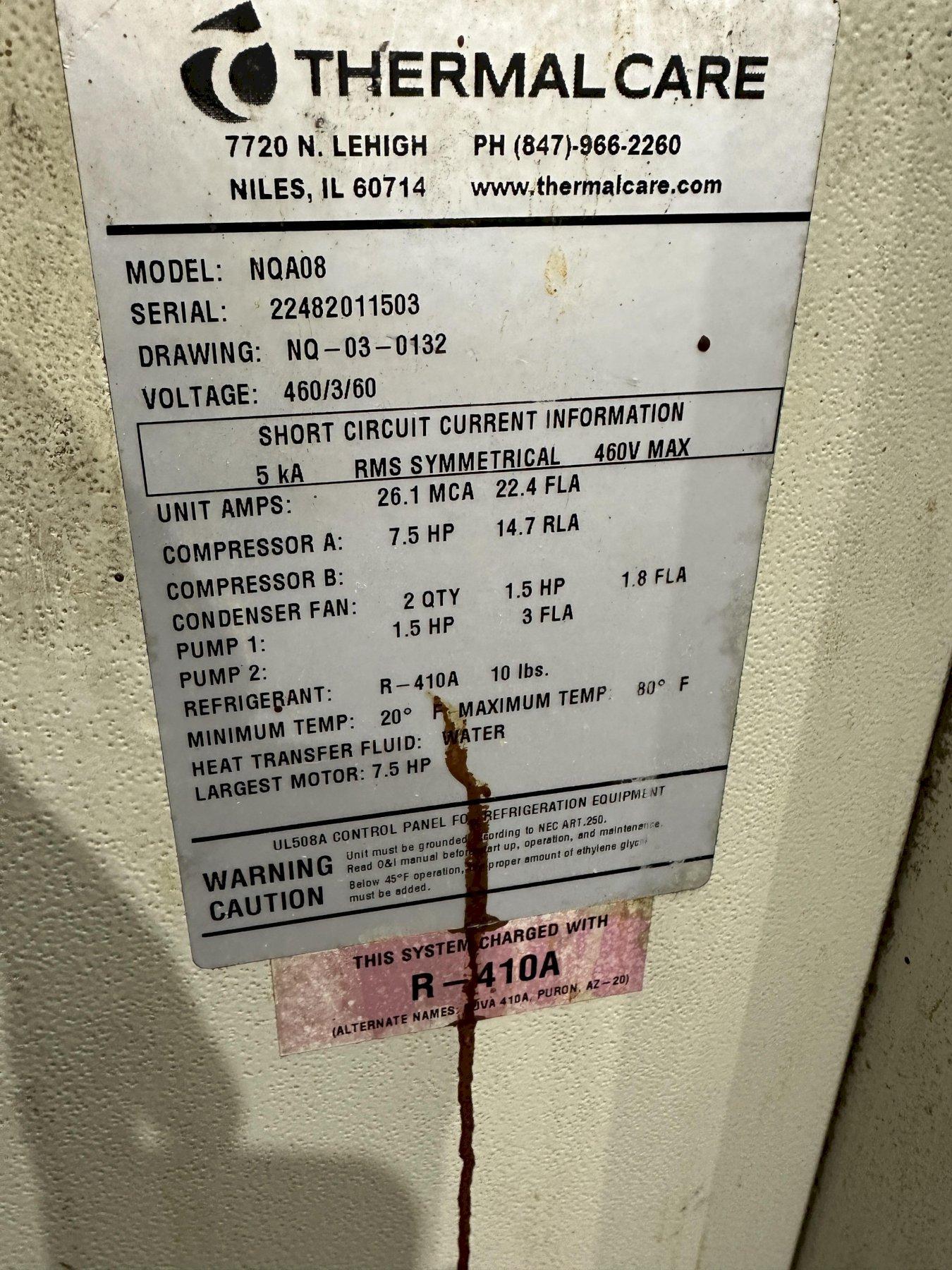 SERIAL ........... 22482011503 MODEL .......... NQA08 YEAR NEW ..... MARCH 2015 COLLING CAPACITY ... 8 TON SET POINT RANGE ... 20 TO 80 SOUND DBA ... 76 RESERVOIR .. 26 PUMP FLOW .. 12 GPM PUMP MOTOR HORSEPOWER 1.5  |