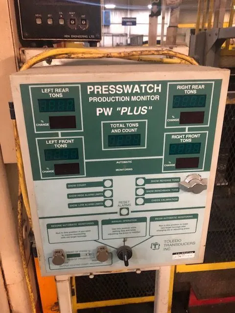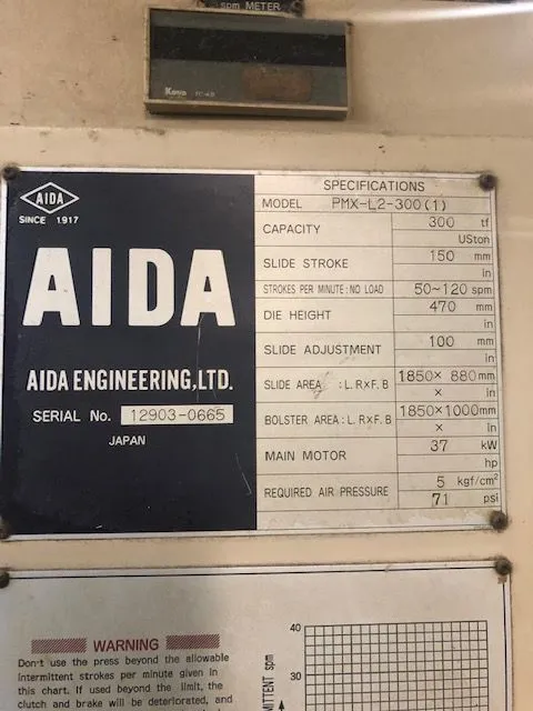 Model PMX-L2-300(1). S/N 12903-0665. Link Drive. 5.90" Stroke. 3.93" Power Ram Adjustment. 18.50" Shut height over bolster. 50-120 SPM. 72.84" x 34.65" Ram. 73.84" x 39.37" Bed. 36.5" Windows. Floor Standing. Air Clutch and Brake. Air Counterbalances. Hydraulic Overloads. Toledo Transducers Press Watch Pro Plus Tonnage Monitor. Sound Enclosure Doors. Light Curtains. 140"LR x 84" FB x 219" Tall. |