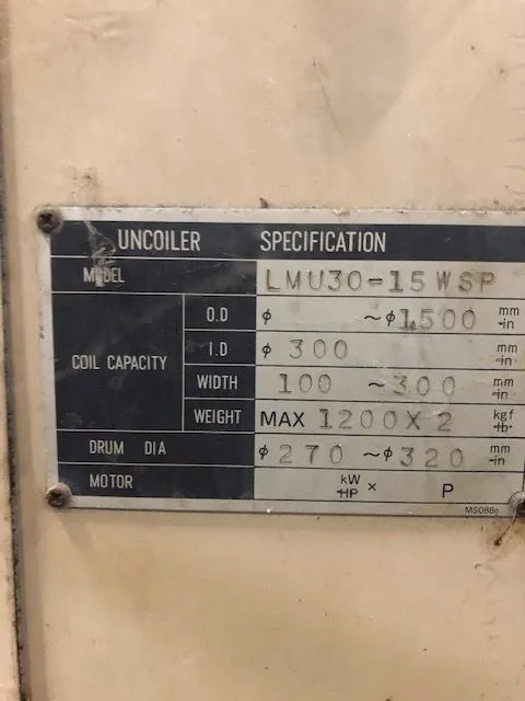 Model LMU30-15WSP. Mach No 15095-2613. S/N 9611-A0620. 12" Wide Coil Capacity. 10.62"-12.60 ID. 59.06" OD. Non Motorized. Manual Expansion. Manual 360 degree rotation. Keepers. FOB Delta Ohio. |