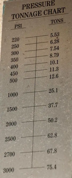 S/N 10686 STROKE 10" DAYLIGHT 24" RAM SIZE 4.5" X 5.5" RAM THREAD THROAT 10" MOTOR 15HP MAX OPERATING PRESSURE 3000 PSI RESERVOIR CAPACITY 150 GALLONS CYLINDER DIA 8" FAST SPEED APPROACH 340 IPM PRESSING SPEED 37 IPM RETURN SPEED 304 IPM APPROXIMATE DIMS 40" X 75" X 97" T APPROXIMATE WEIGHT 10,000 LBS |