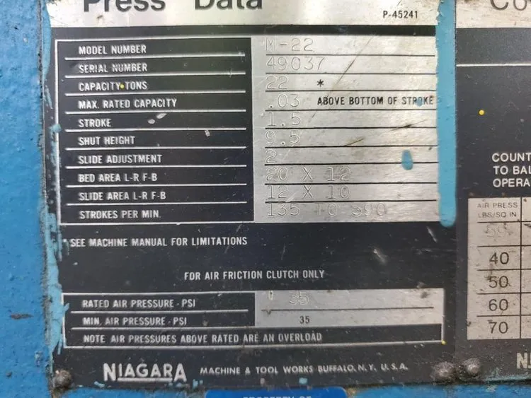 SPECIFICATIONS: TON 22 T BED L-R 20 in BED F-B 12 in STROKE 1.5 in SHUT HEIGHT 9.5 in SPEED 390 spm,Capacity: 22 Ton Stroke: 1.5” Adjustment: 2” Shut Height: 9” Bed Area: 20” lr x 12” fb |