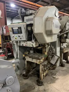 TON PRECISION GAP FRAME PRESS. STOCK# 13566J MODEL #: 45G SERIAL #: PN0172 3" STROKE 11" SHUT HEIGHT 2.5" RAM ADJUSTMENT 68 SPM 28" x 18" BED 17" x 13" RAM AIR CLUTCH & BRAKE PALM BUTTONS INCH SINGLE AND CONTINUOUS MODES BACK GEAR DESIGN YEAR: 2000 GOOD CONDITION |