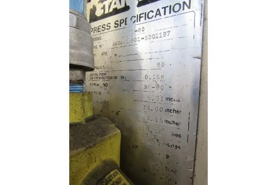 MDL#G1-80 S/N# A10321 B01-SOO1197 CAPACITY 88 TON 5.91" STROKE 13" SHUTHEIGHT 3.15" RAM ADJUSTMENT POWERED 35-80 SPM 22.05" X 16.54" RAM 39.37" X 21.65" BED AIR CLUTCH AIR BRAKE AIR COUNTERBALANCE HYD OVERLOADS PRESS PADS PALM BUTTONS WINTRESS SMART PAC 2 55" X 80" X 128" T 15,000 LBS APROX |
