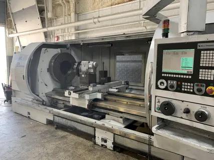 Swing over bed - 39.7" Swing over gap - 50" Swing over cross slide - 26.6" Gap distance - 14.6" Center distance - 160" X-Axis travel - 21" Z-Axis travel - 160" Spindle bore - 14" Spindle nose - A2-20 Spindle speed range low - 10 to 375 rpm Spindle speed range high - 10 to 500 rpm 2-Speed AC Spindle motor (1 min / 30 min) - 35/25 HP Tailstock quill travel - 9" Tailstock quill diameter - 4.92" Tailstock quill taper - MT6 Automatic turret - 12 Tools Tool selection - bi-directional Turret tooling size - 1" X,Z axis rapid traverse rate - 500 ipm Max cutting feed rate - 100 ipm Machine height - 90" Floor space - 272" L x 110" D Machine weight, approx - 29,000 lbs. Includes the following: Milltronics 7200 Conversational CNC Control |