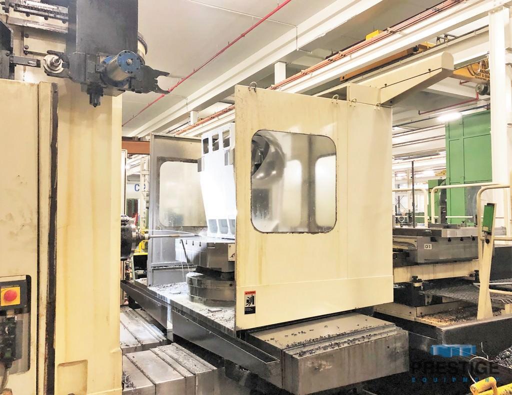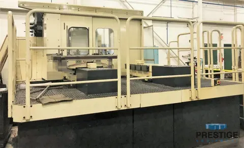 Spindle Diameter 4.33" Extended Quill Diameter 7.87" Taper In Spindle #50 Vertical Head Travel, Y-Axis 39.37" Table Cross Travel, X-Axis 39.37" Spindle Travel, Z-Axis 15.74" Saddle Travel, W-Axis 27.55" Table Size, (2) Pallets 39.37" x 39.37" Table Capacity 6,000 lbs Table Indexing 0.001 Degree Rapid Traverse (X,Y,Z Axes) 472.4 IPM Feed Rates .04-236.2 IPM Table Load Capacity 6,600 LBS Spindle Speeds (2 Ranges) 20-3000 RPM Floor Space, L x W x H 173" x 174" X 126" Machine Weight 39,600 lbs. Equipped With: Tosnuc 888 CNC Controls 40-Station Automatic Tool Changer (2) 39.37" x 39.37" Pallets with Pallet Shuttle System Thru Spindle Coolant Marposs Probing System Chip Conveyor 30 HP Spindle Motor |