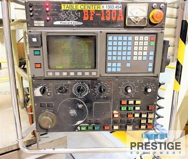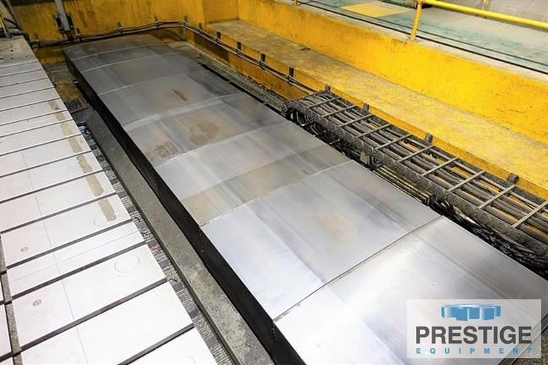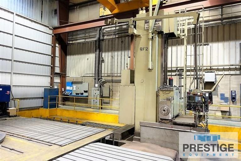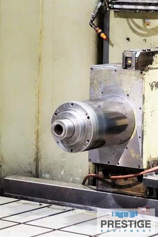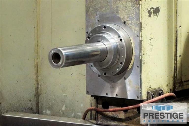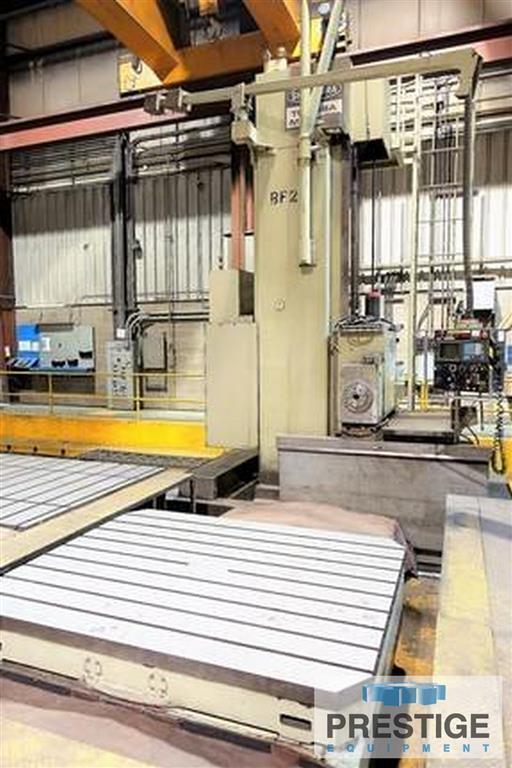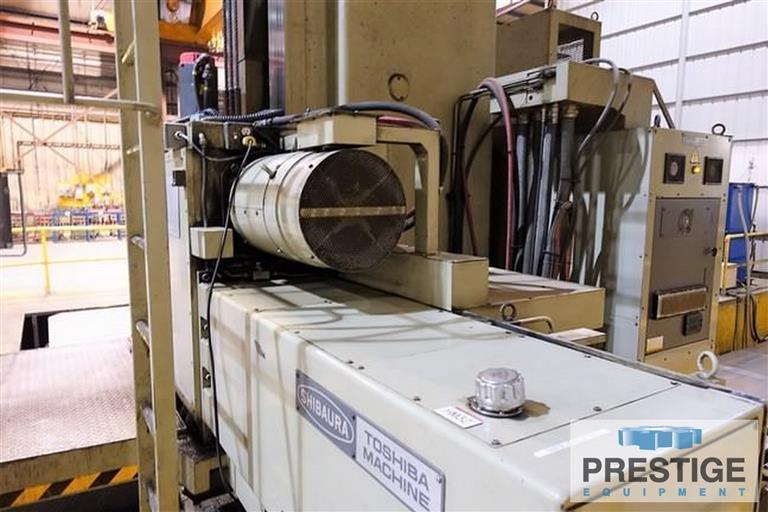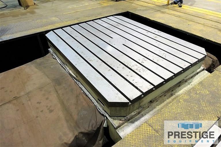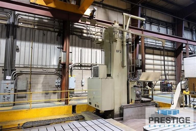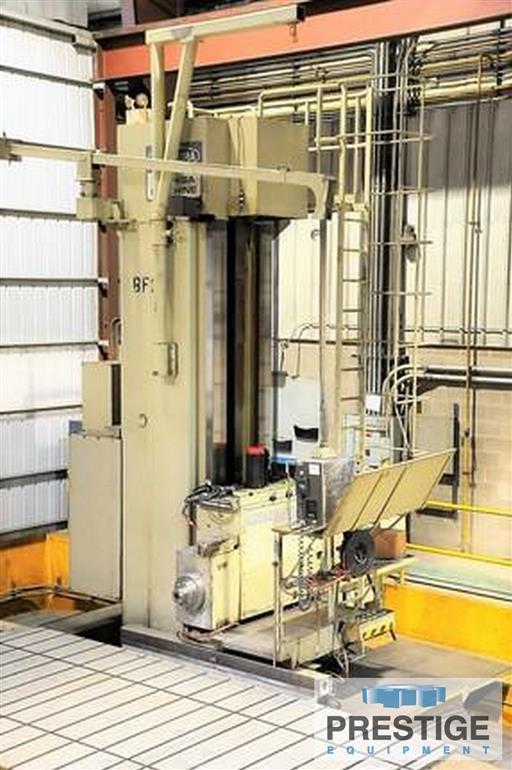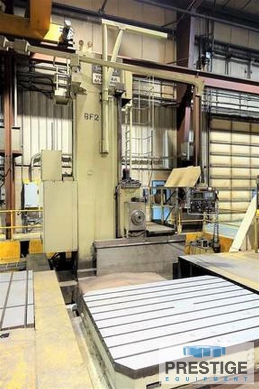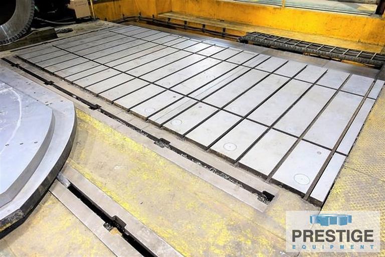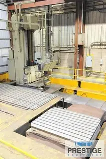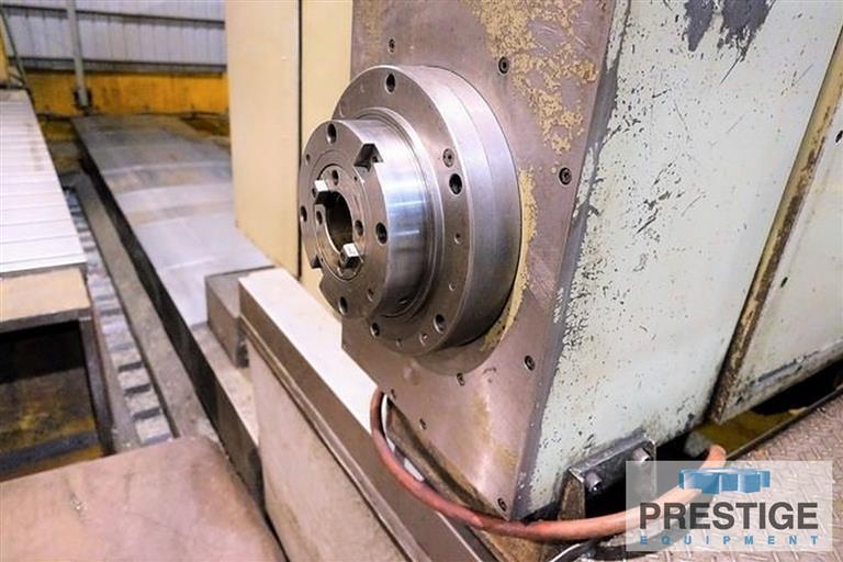 Spindle Diameter 5.12" Quill Diameter 13.38" Milling Sleeve Diameter 8.8" Vertical Headstock Travel, Y-Axis 118.11" Column Travel, X-Axis 295.27" Boring Spindle Travel, Z-Axis 39.37" Quill Travel, Z-2 Axis 17.7" Total Axial Travel, Spindle & Quill 39.37" Spindle Speed Ranges 2 Spindle Speeds, Infinitely Variable 10-1250 RPM Spindle Taper #50 Feeds, Variable 0.04 - 157 IPM Rapid Traverse 157 IPM Spindle Motor 30 HP / 40 HP Approx. Machine Dimensions 496" x 175" x 289" Machine Only Weight 69,500 Lbs TOSHIBA CNC INFEEDING ROTARY TABLE: Table Size 78.74" x 98.42" Table Infeed 78.74" Table Rotation .001 IPM Table Weight Capacity 97,000 Lbs Equipped With: Fanuc 15M CNC Control Toshiba BD 20/25 CNC Infeeding Rotary Table 189" x 94" T-Slotted Floor Plate Telescoping Way Covers on Runway Ball Screws & Independent Drives 40 HP Spindle Drive |