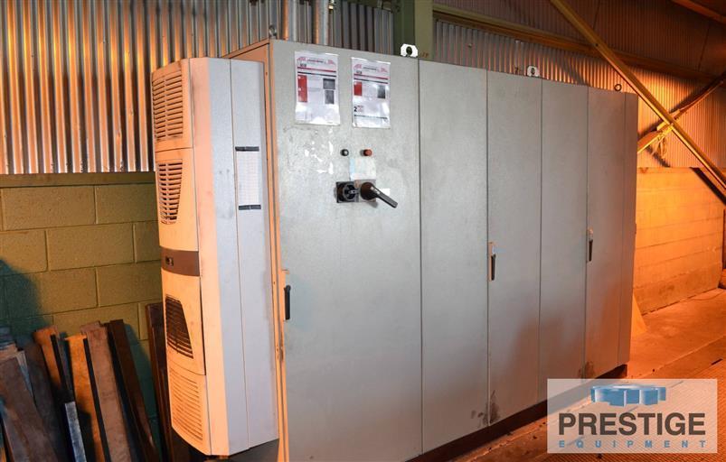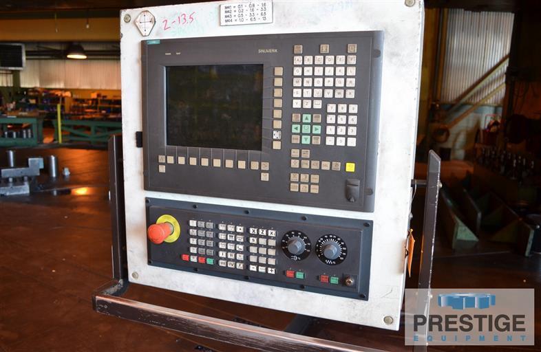 Table Diameter 393.37" Turning Diameter with Vertical Rams 590.55" Maximum Turning Height 196.85" Ram Vertical Travel 78.74" Ram Swivel +/- 30/15 Deg Maximum Cutting Force Right Rail Hd 27,558 Lbs. Table Load Capacity 440,925 Lbs. Table Speed Ranges, Inf.Variable 4 Table Speeds 0.13 to 13 RPM Rapid Traverse, X & Z Axis 64.17" IPM Creep Feed Motion, X & Z Axes 0.118 IPM Cross Rail Elevation Motor 40.23 HP Number of Feeds, Vertical & Horiz. 30 Vertical Ram Feeds .00196-1.574 IPR Horizontal Ram Feeds .00196-1.574 IPR Cross Rail Adjustment Motor 86 HP Rapid Traverse Motors 15.5 HP Main Motor 250 HP Equipped With: Siemens 840D CNC Control New 1999 Dual Pendant Operated Controls 2-Vertical CNC Controlled Rams 393.37" Diameter T-Slotted Table 4-Heavy Duty Face Plate Type Jaws Hydrostatic Bearing System For Table Dual Operators Platforms Dual Jorgansen Chip Conveyors 250 HP Table Motor Rebuilt and Retrofit: Rebuilt & CNC Retrofit in 1999. New Ball Screws, Refitted Column, Saddle and Rams, New Drives, New Clutch System, Electrics |