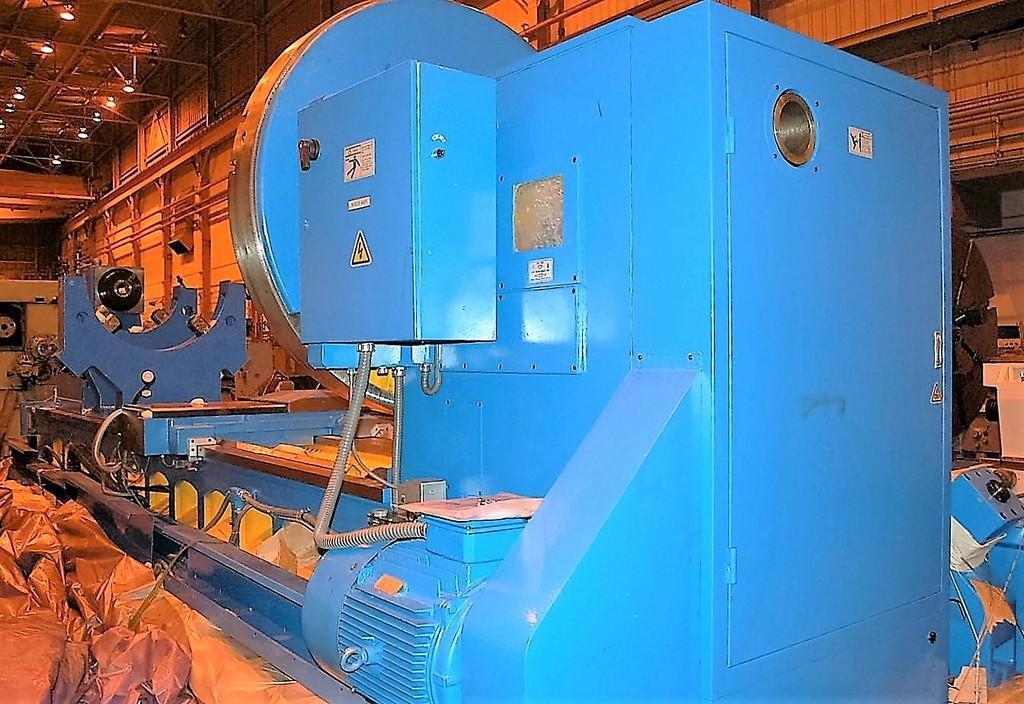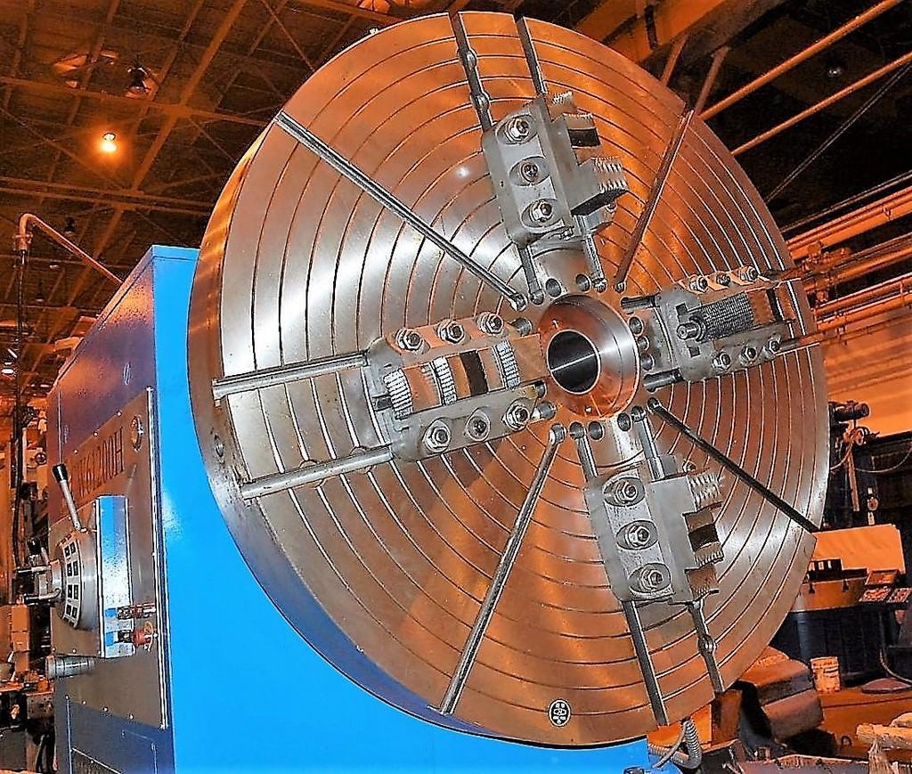 Swing Over Bed 80.31" Swing Over Cross Slide 64.96" Width of Guide Way 43.30" Distance Between Centers 236.22" Spindle Speeds (21 Speeds) 3.15-315 RPM Spindle Bore 5.12" Spindle Nose A-15 Tailstock Diameter 11.02" Tailstock Travel 11.81" Taper of Tailstock Bore 140 Metric Weight Capacity 33,000 lbs Equipped With: 78.74" Diameter Face Plate with 4-Top Jaws Flame Hardened Bed Ways (2) Roller Type Steady Rest: 18.89 & 39.37" Power Drive To Top Slide For Conical Cutting Swivel Compound Inch / Metric Threading Built in 4-Way Tool Post Pan Bed and Coolant System Live Quill in Tailstock Motorized Tailstock 40 HP Drive Motor With Controls 3/60/440 Volt Electrics 1-Year Parts Warranty DELIVERY: Approx. 5-Months From Order |