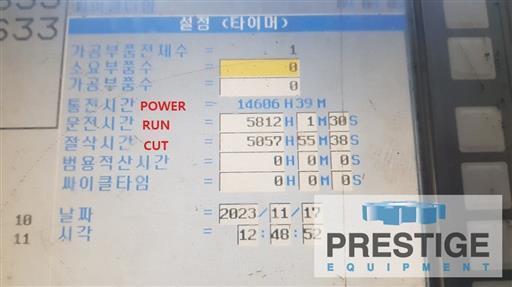 X-Axis Travel 118.11" Y-Axis Travel 59.05" Z-Axis Travel 31.49" Distance Between Columns 66.92" Table Size 118.11" x 53.14" Table Capacity 17,600 lbs Spindle Speeds 12,000 RPM Spindle Drive Motor 40 HP Spindle Taper #50 Equipped With: Fanuc 31iB CNC Control 40-Station Automatic Tool Changer Scales 40 HP Spindle Motor Chip Conveyor HOURS: Power On Hours: 14,606 Cutting Hours: 5,057 |