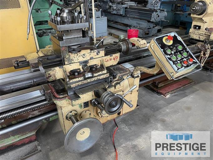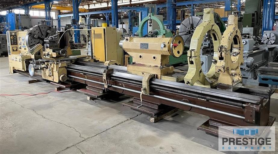 Maximum Swing Over Bedways 46" Maximum Swing Over Cross Slide 33" Distance Between Centers 196.85" Maximum Swing In Gap 58" Length Of Gap 20" Spindle Speeds: (21) 5-500 RPM Spindle Hole 4.75" Weight Capacity Between Centers 17,600 Lbs Weight Capacity W/ 2-Steady Rests 26,400 Lbs Equipped With: 39.5” Dia.4-Jaw Chuck 25” Dia. 3-Jaw Chuck 4 Way Toolpost Inch / Metric Threading Taper Turning Attachment Power Compound for Taper Turning 6-Way Power Rapid Traverse (2) Roller Type Steady Rests- 27” and 15” Capacity Follow Rest Heavy Duty 2 Speed Tailstock Pendant Control on Carriage Chip Pans with Coolant Pump Hardened Ways |