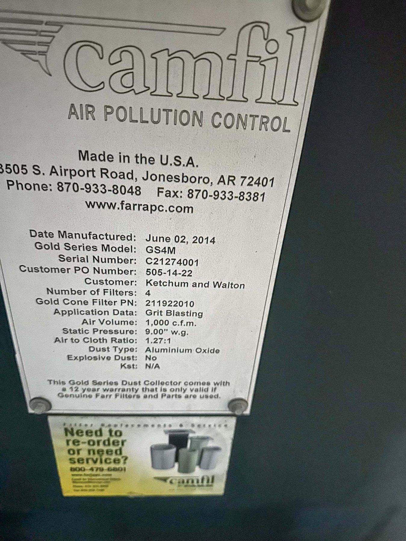 SERIAL ..... C2127-4001 MODEL ... GOLD SERIES .. GS4M YEAR NEW .... 2014 AIR VOLUME ... 1000 CFM STATIC PRESSURE .... 9.00" W.G. NUMBER OF FLITERS .... 4 AIR TO CLOTH RATIO ... 1.27:1 DUST TYPE ... ALUMINUM OXIDE MOTOR HORSEPOWER ... 3 |