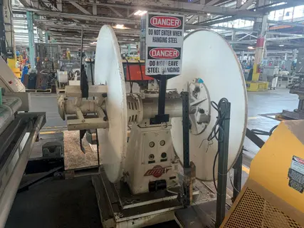 Coil weight capacity: 4,000 Lb. Coil width capacity: 12" Expansion range: 16" - 20" Coil O.D. capacity: 60" Littell Pull Off Double End Coil Reel Uncoiler Equipment and Features: Double end pull off coil reel uncoiler Four leaf mandrel coil reel (per side) Coil keeper arms Front mounted manual coil reel expansion Expansion handles Coil reel backing plates Manual adjustable centerline via ratchet handle Air brakes mounted on main coil reel spindles Adjustable tensioning Foot pedal release for arbor rotation |