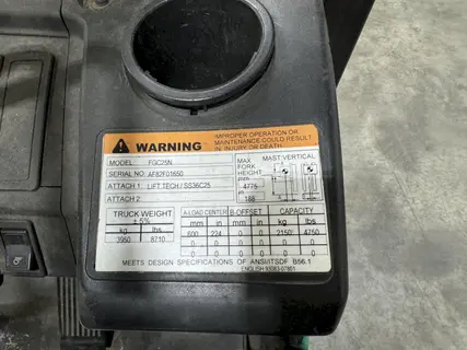 SERIAL ..................... AF82F01650 MODEL ...................... FGC25N YEAR NEW ................... 10/2005 CAPACITY ................... 5000 LB MAST HEIGHT RAISED ......... 187 MAST HEIGHT LOWERED ........ 6.93" MAST FREE FLOAT HEIGHT ..... 54" MAST TILT .................. 5 DEGREE & 9 DEGREES SIDE SHIFT ................. YES FRONT TIRES ................ 21" X 7" X 15" REAR TIRES ................. 16" X 6" X 10.5" AUTOMATIC TRANSMISSION ..... FORWARD & REVERSE FUEL ....................... LP GAS MAX SPEED ... 11 MPG CYLINDERS .................. 4 FORK LENGTH ................ 48 "X 6" X 2" TILT STEERING WHEEL ........ YES CARGO LIGHTS ............... YES WIDTH OF LIFT .............. 41" LENGTH WITHOUT FORKS ....... 7.73" TURNING RADIUS ... 6.63 FT IN |