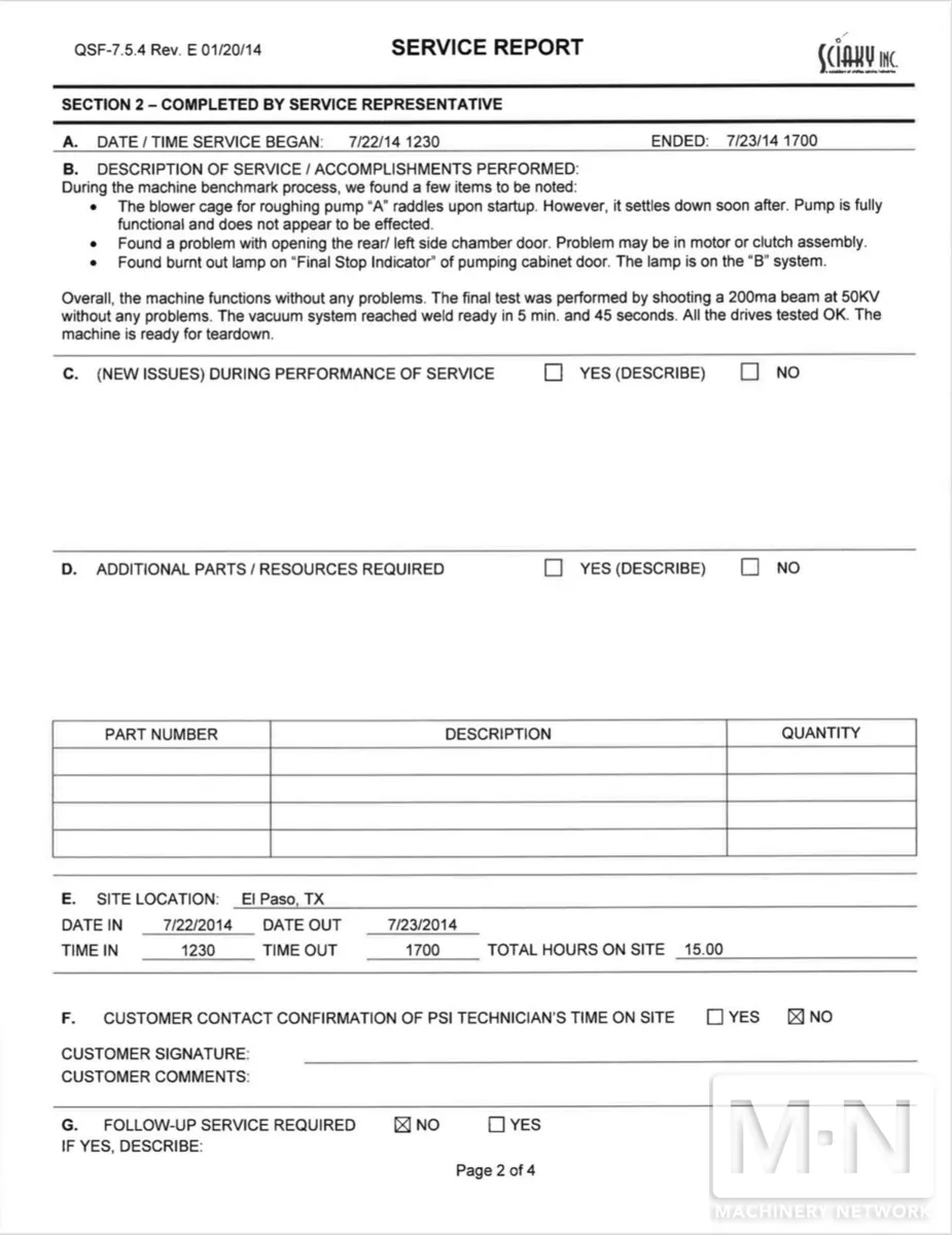 OverviewDescriptionThe machine is a 30KW W2000 computer-controlled hard vacuum beam welder, with an internally mounted low voltage (60KV) gun and a motorized work carriage. It provides significant advantages in energy efficiency, weld rate, part handling, motion, cycle time, and accuracy. EBW-112x102x66 Specifications: