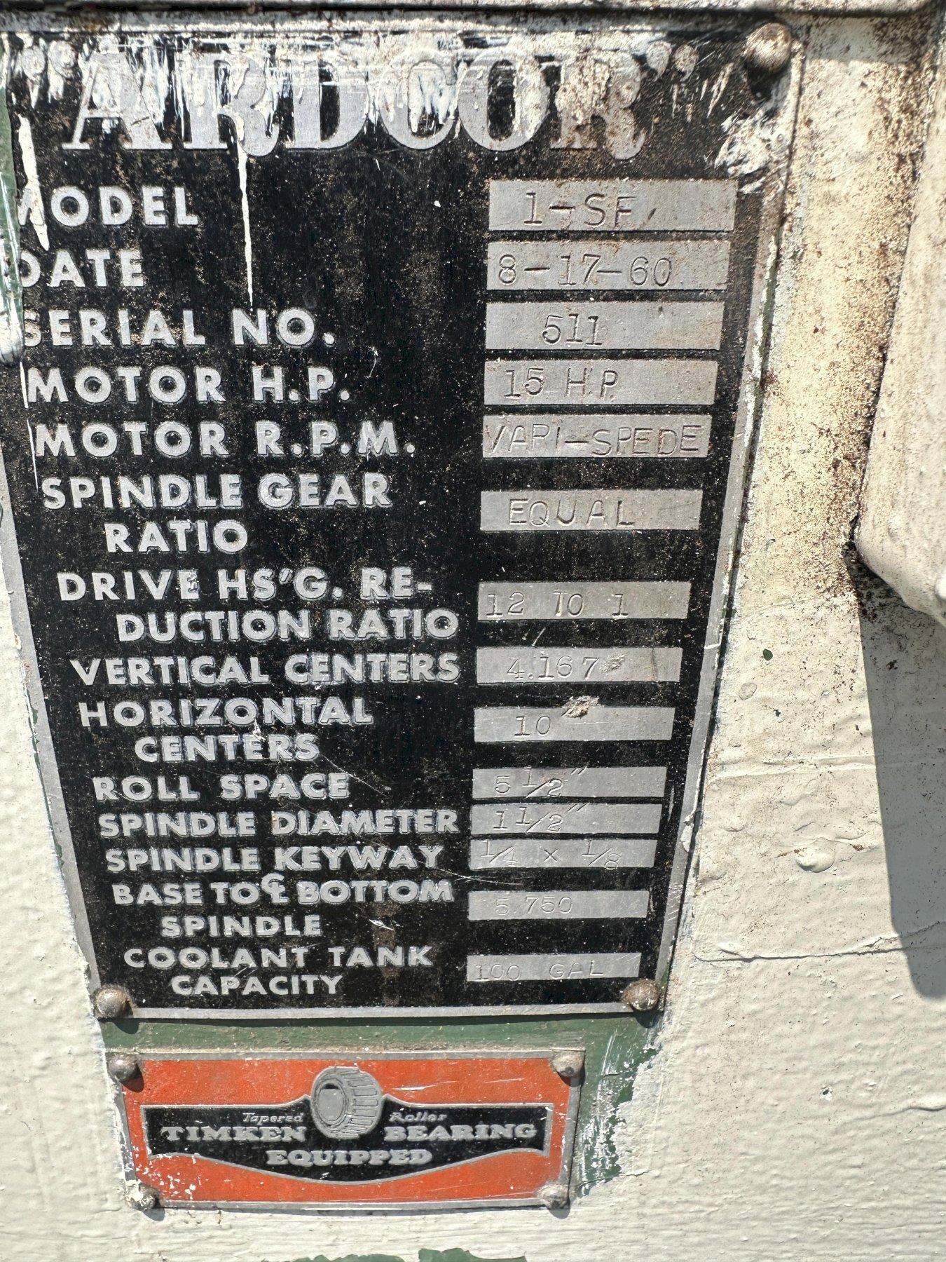 SERIAL ................... 511 MODEL .................... 1-SF STANDS ................... 12 SPINDLE DIAMETER ......... 1-1/2" ROLLSPACE ................ 5.5" HORIZONTAL CENTERS ....... 10" VERTICAL CENTERS ......... 4.167"" BASE TO BOTTOM SPINDLE ... 5-3/2" EQUAL GEARED ............. YES MOTOR .................... 15 HP |