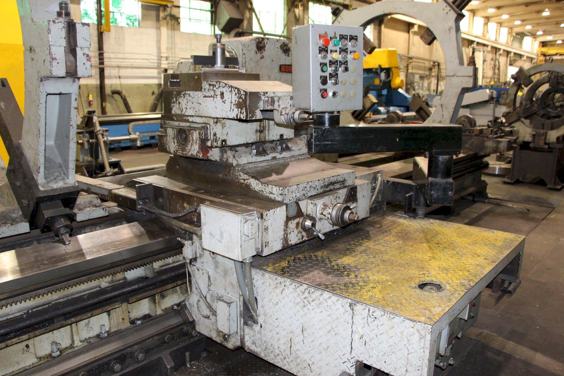 SERIAL .......................... 692803 SWING OVER WAYS ................. 72" SWING OVER CROSS SLIDE .......... 60" DISTANCE BETWEEN CENTER ......... 480" SPINDLE SPEEDS .................. 0.8-130 RPM FACE PLATE TYPE CHUCK ........... 60" 4 JAW DIAMETER OF SPINDLE HOLE ............ 5" STEADY REST LO ROLLER ........... 56" STEADY REST LO BEARING .......... 56" LEAD SCREW THREADING ............ YES THREADS ENGLISH .... 4 TO 56 TPI THREADS METRIC ... .05 TO 7 MM 3-WAY BED ....................... YES RAPID TRAVERSE .................. YES POWER COMPOUND .................. YES POWER CROSS SLIDE ............... YES POWER TAIL STOCK ................ YES MOTOR .........................,. 50 HORSEPOWER |