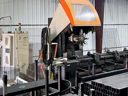 Equipped With: 8 Pneumatic Clamps Windows Platform (XP Version) Network Connection Angle Router Head (Processing Front and Back of the Profile) Reduced Speed Spindle-Reduction 5:1 (4,000 rpm-max.) Two-Sectional Clamping System Air Conditioning Unit Photo Electric Barrier (Front of Machine) Safety Fence (Left and Right Side of the Machine) Hand-Held Mobile Control w/ Start/Stop Switch & Feed Control Recognition of Clamp Positions Automatic Clamping Positions Automatic Protection/Safety Cover Chip Collection Tray