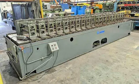 MODEL ..................... 450-22 08 SERIAL .................... 939 SHAFT DIAM ................ 2" STAND COUNT ............... 20 ON A 22 STAND BASE ROLL RANGE ................ 4.50" - 5.75" ROLL SPACE ................ 24" HORIZ CENTER .............. 10" SPEED RANGE ............... 30-90 FPM VOLTS ..................... 440 PHASE ..................... 3 CONTROLS .................. 115V OVERALL SIZE .............. 240" L X 68" W X 52" H WEIGHT .................... 35,500# |