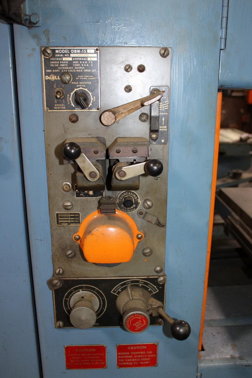 SERIAL ......................... 383-79123 MODEL .......................... 2012-2H YEAR NEW ....................... 1979 THROAT, BAND TO COLUMN ......... 20" MAXIMUM WORK HEIGHT ............ 12" BAND WIDTH CAPACITY ............ 1-1/16" TO 1" SAW BAND LENGTH ................ 154" BAND SPEED RANGE ............... 5 TO 5200 FPM, VARIABLE TABLE SIZE ..................... 26-1/2" X 33-1/2" TABLE STROKE ................... 12" TABLE FEED, HYDRAULIC .......... 0 TO 6 FPM TABLE FEEDING FORCE ............ 0 TO 175 LBS TABLE TILTS .................... 45 DEGREES LEFT, 10 RIGHT TABLE WEIGHT CAPACITY .......... 500 LBS HI TORQUE DC ELECTRIC DRIVE .... YES WELDER/GRINDER/SHEAR ........... DOALL MODEL DBW-15 MOTOR .......................... 5 HORSEPOWER |