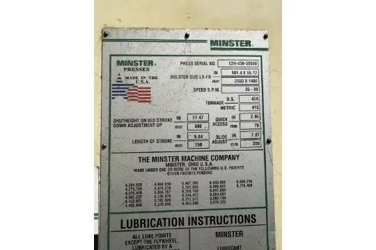 CAPACITY 180 TONS STROKE 5.91" SLIDE ADJ 5.91" SHUT HEIGHT 23.62" SPEED 0-150 SPM BED AREA 74.8" LR X 33.5" FB SLIDE AREA 74.8" LR X 33.5" FB OAD 127" W X 80" FB X 188" T APPROX WEIGHT 77,000 LBS |